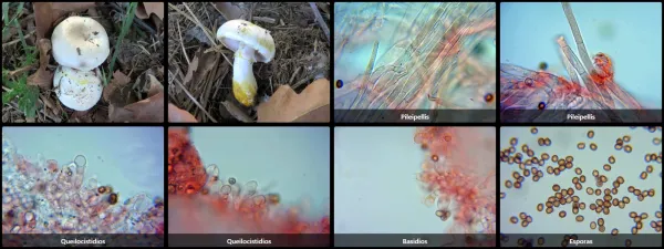 Sombrero que puede superar los 10 cm, de color predominantemente blanco, aunque existen variedades con tonos más grises. La parte superior es típicamente aplanada confiriéndole al sombrero una forma de trapecio o "casco alemán". El margen es un poco lobulado y a veces resquebrajado. Se mancha vivamente de amarillo con solo frotarlo.