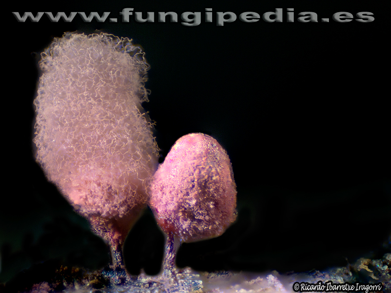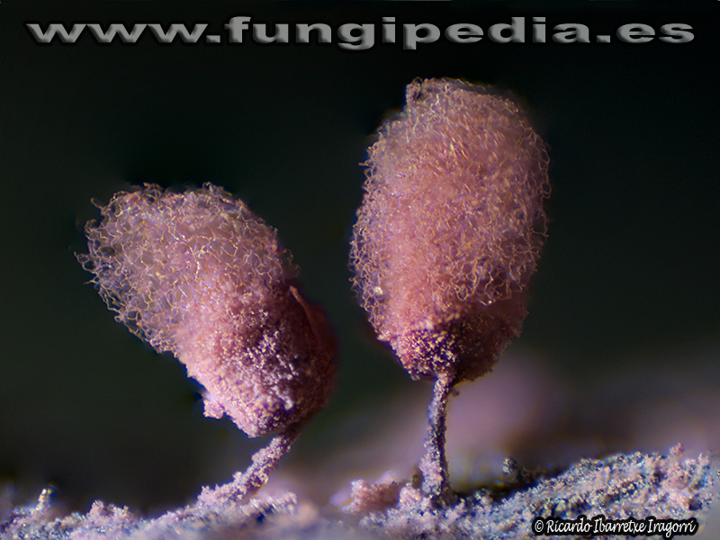 Esporóforo erecto de crecimiento individual pero gregario, con una altura que apenas llega a los 2 o 3 mm. Su desarrollo parte del mucus de un plasmodio de color blanco que forma el hipotalo, y que se reúne en pequeñas protuberancias que adoptan un color rojizo, su desarrollo myxogasteroide hace que se eleve un pie que puede mantener el color rojizo o volverse marrón y que es macizo. En la cúspide de este tallo se desarrolla la cabezuela fértil al principio globosa, pero que se alarga rápido hasta adoptar una forma ovoide, esta cabezuela alberga en su interior las esporas y el capilicio. Al romperse la cobertura externa o peridio , que es liso, se libera el capilicio, que es siempre muy abundante y puede presentar un color rosado, rojizo, o finalmente marrón con matiz rojizo. Este capilicio está compuesto por fibras con medios anillos resaltados en forma de espiral de 3 o 4 micras de diámetro que no son muy homogéneos y dan paso a otras zonas más verrucosas, el aspecto viéndolo lateralmente es el de ser fibras crestadas. Siempre presenta en la unión entre pie y cabeza fértil una especie de calículo embudado y algo reticulado al que se fija el capilicio.