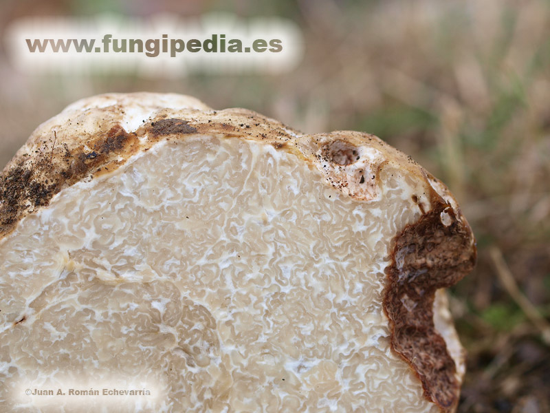 Peridio liso no dehiscente pero a su vez irregular, ya que con la maduración se produce un agrandamiento de la gleba que provoca muchas veces el agrietamiento del peridio. Tiene un color blanquecino cremoso, sobre todo de joven, deviniendo a tonos más grises y posteriormente adopta color ocráceo e incluso pardo rojizo cuando es muy viejo.