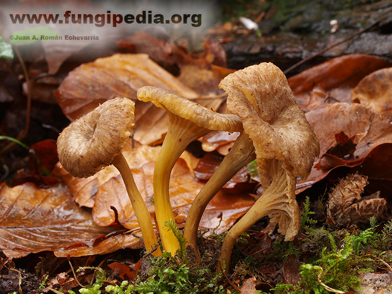 Sombrero de unos 5 cm de diámetro en estado adulto, profundamente umbilicado, de forma plana, aunque el hundimiento que tiene en el centro con la edad llega dentro del pie. Es de color un tanto variable, generalmente pardo con matices amarillentos u ocráceos. El borde suele ser más amarillento y está ondulado e incurvado irregularmente.