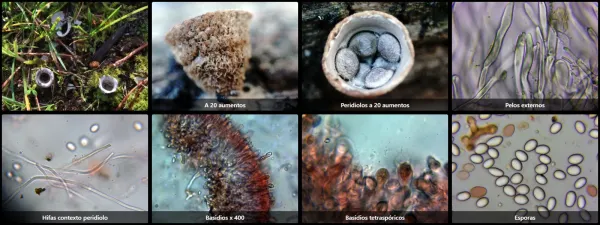Carpóforo con forma cilíndrica o de canuto en sus primeros estadios, recubierto en la zona superior por una especie de tapa llamada epifragma, este es de color blancuzco o algo amarillento en ocasiones. Cuando el hongo evoluciona el epifragma se rompe y el espécimen adopta una forma típica de nido o taza, con una altura que puede alcanzar 1,5 cm y un diámetro aproximado de 1. Tiene tres partes diferenciadas, la superficie externa o exoperidio es básicamente gris y tomentoso, aunque puede tener matices pardos o tostados, el endoperidio es sin embargo liso, carente de pliegues o estrías, y más claramente gris.