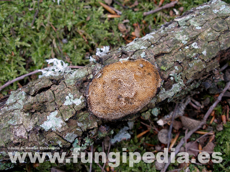Himenio formado por tubos muy cortos dispuestos en capas, cada uno de ellos de apenas 1 o 2 mm de longitud y color ocre claro, y poros laberínticos irregulares, cuyo tamaño es de 1 o 2 por mm, de color que evoluciona desde el crema de su juventud, hasta tonos marrones en la vejez.