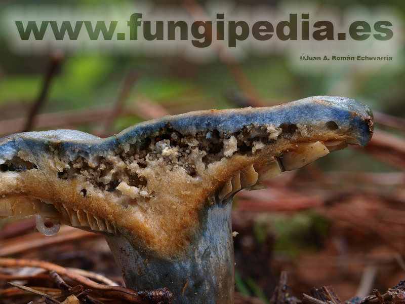Carne firme y compacta, presenta al corte longitudinal una línea amplia de color azul indigo bajo la superficie del sombrero, presente en todos los ejemplares recolectados. Al cabo de unas horas esta línea deviene en un color verde claro. El resto de la carne tiene un tono naranja pálido, a veces casi blanquecino, exudando un látex escaso de color naranja que al secarse se vuelve primero verde y posteriormente rojo vinoso. Tiene un olor fúngico agradable pero algo fuerte y un sabor ligeramente picante en crudo.