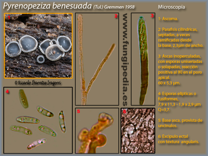 Himenio liso de color gris más oscuro que la superficie externa, a veces con leve matiz azulado. Produce ascósporas oblongo-fusiformes de 9 o 10 micras por 2 o 3, y paráfisis filiformes.