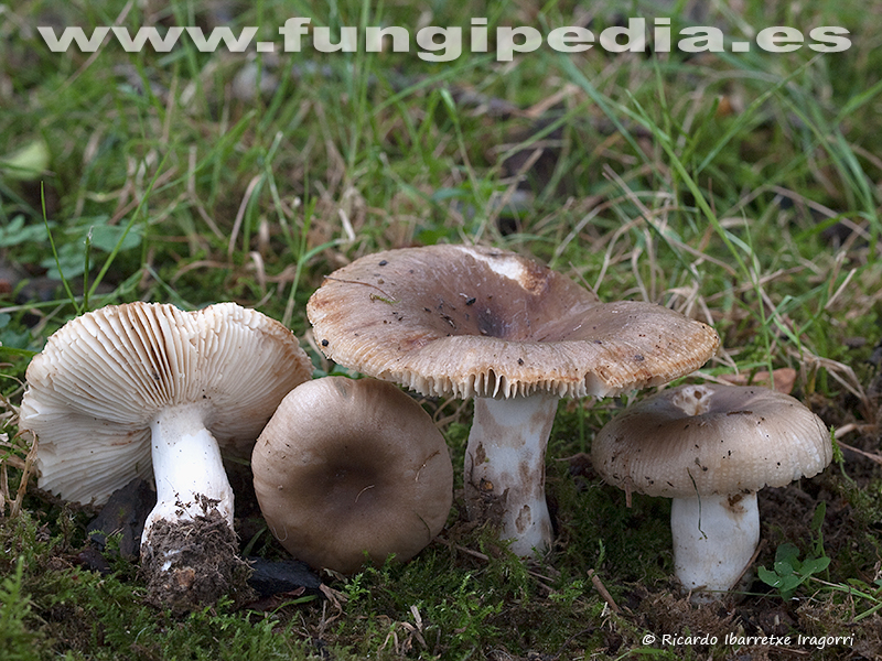 Pie cilíndrico de color blanco, de tamaño proporcionado al sombrero o corto. Cuando la seta es joven es lleno, pero se va quedando hueco con el tiempo. Los especímenes viejos presentan la base teñida con tonos pardos sucios.