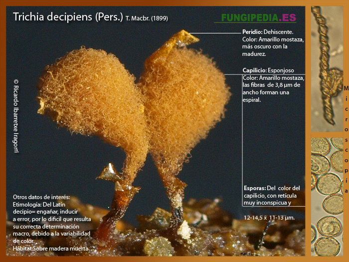 Es la especie más habitual del grupo de las Trichias, caracterizada por su variabilidad de color, y su capilicio ocre amarillento con fibras dispuestas en espiral, y sin estrías longitudinales. Se puede confundir con un montón de especies, al punto que sin la inestimable ayuda del microscopio su identificación sería problemática. De hecho, se pueden confundir con otras de su mismo género, como la Trichia pesimilis, que solo se diferencia por los retículos que ornamentan sus esporas, y con muchas Arcyrias, como la Arcyria pomiformis.