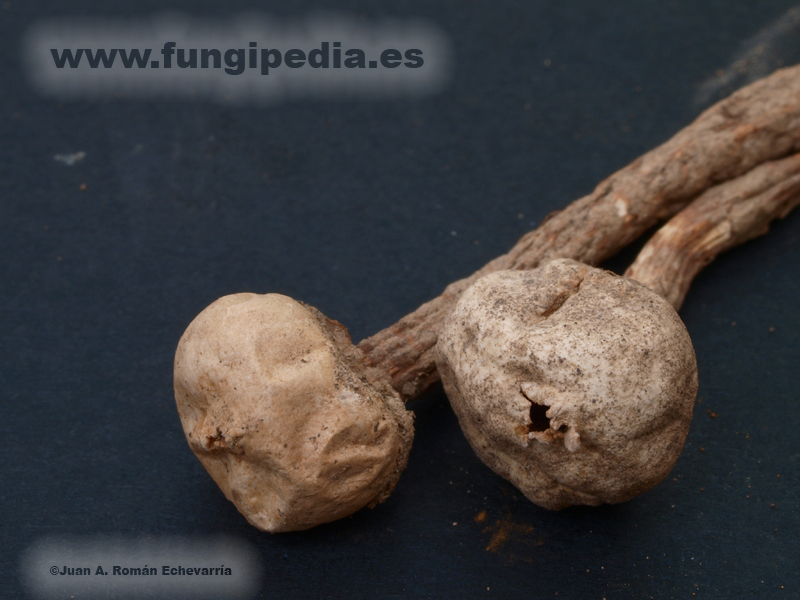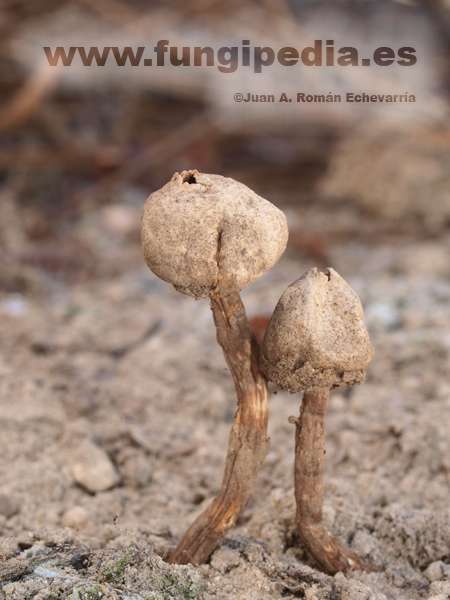 Cabeza irregularmente globosa con la zona inferior algo más hundida, pero sin llegar tampoco a ser plana, es relativamente habitual que forme en esta zona un pseudocollar de fibras entrelazadas. Su diámetro oscila entre 0`5 y 1`5 cm, pudiendo alcanzar a veces los 2 cm, su exoperidio es tan fugaz que rara vez se aprecia, y su endoperidio es de color blanquecino o crema con cierto matiz grisáceo. La dehiscencia se produce por un ostíolo apical mal delimitado apenas resaltado y fimbriado, sin que tenga ningún halo circundante.