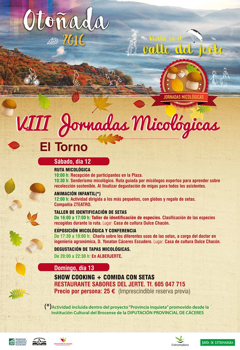 - 14:00 h: La mañana del domingo se desarrollará un Show cooking seguido de una comida especial en Restaurante Sabores del Jerte (Plaza Mayor de El Torno, 1). En el Show conoceremos diferentes formas de preparar estas delicias del otoño y la comida estará especialmente diseñada para la ocasión y elaborada, por supuesto, con setas. El precio de este evento del domingo es de 25 €/persona y se abonará in-situ.