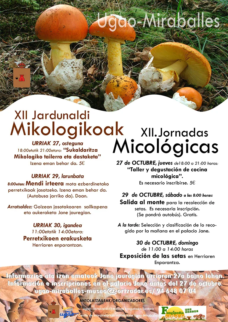 Como cada otoño el Centro de Interpretación Histórica, con la ayuda inestimable de los micólogos de Fungipedia y de diferentes vecinos y vecinas, organiza las Jornadas Micológicas de Ugao-Miraballes. En esta decimosegunda edición no faltarán la tradicional salida montañera para buscar las setas, la clasificación de las mismas, dirigida por expertos, y la exposición micológica de todo lo recogido por los vecinos y vecinas.