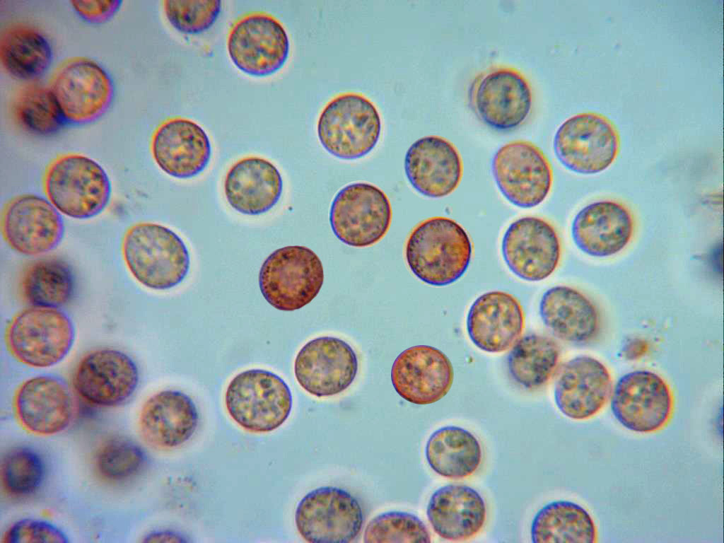 Esporas en agua destilada, de forma entre esférica, ovoide y elíptica, y con tenue contenido en su interior, en mis mediciones de 8,9;11,5 X 6,8;8,7 micras.