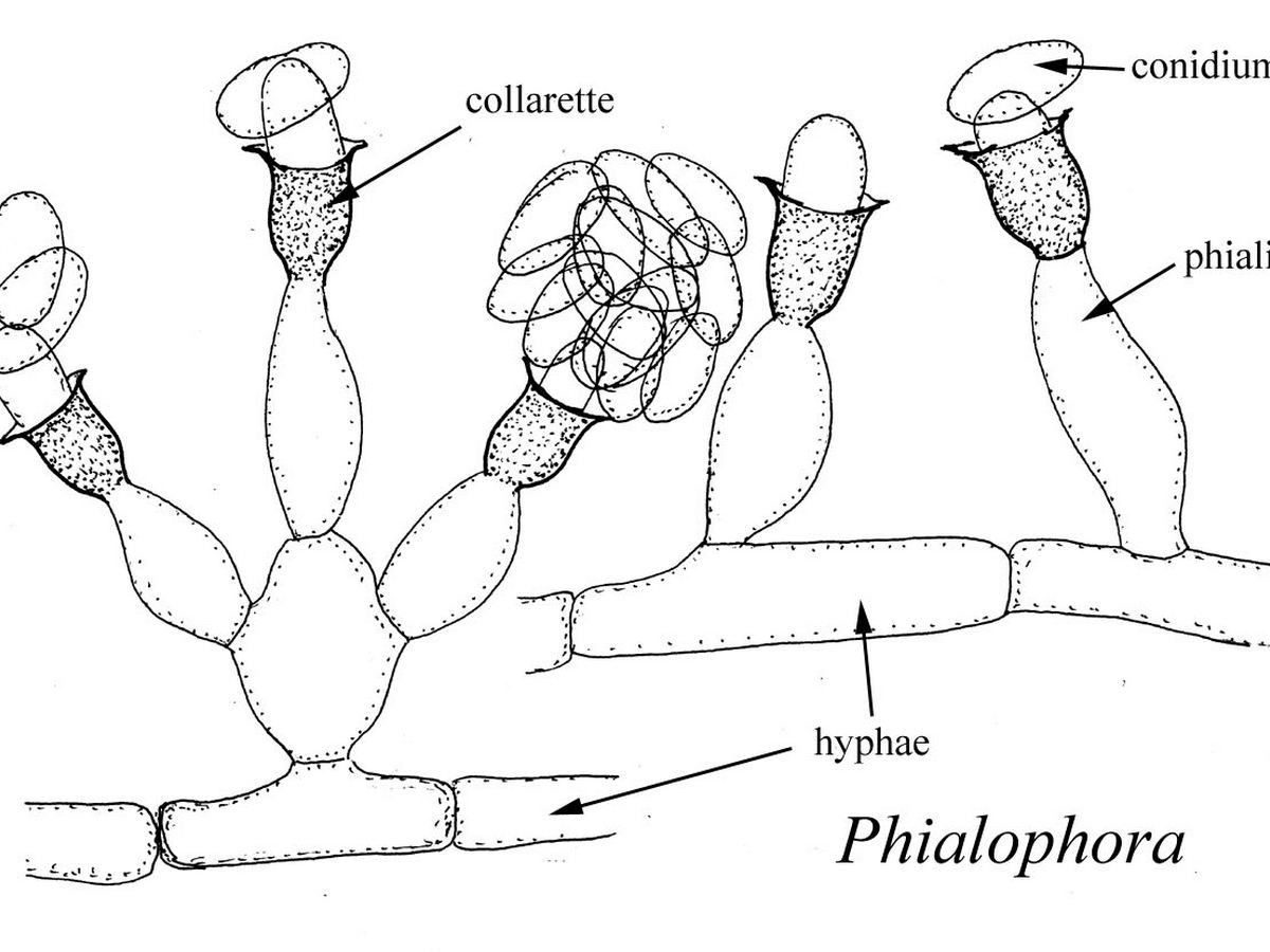 Lo raro y curioso de todo esto es la gran presencia de estas Phialophoras con Fiálides en forma de floreros, sésiles de base ancha, cuello estrecho y collarete terminal.