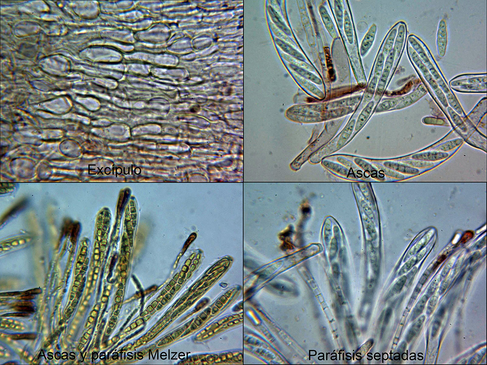 Las ascas con reacción amiloide en el aparato apical, las paráfisis septadas y con contenido refractivo en el ápice y esporas con tres septos, estos muy visibles con Melzer y unas medidas de las esporas en agua de: