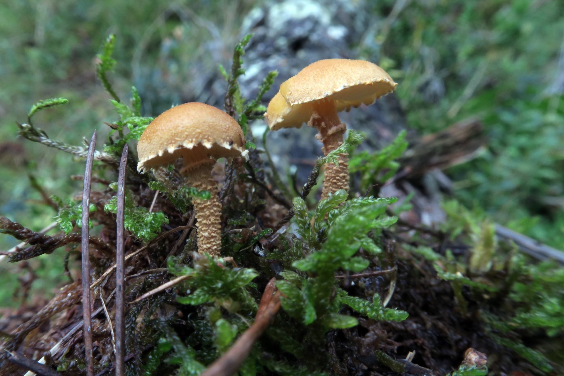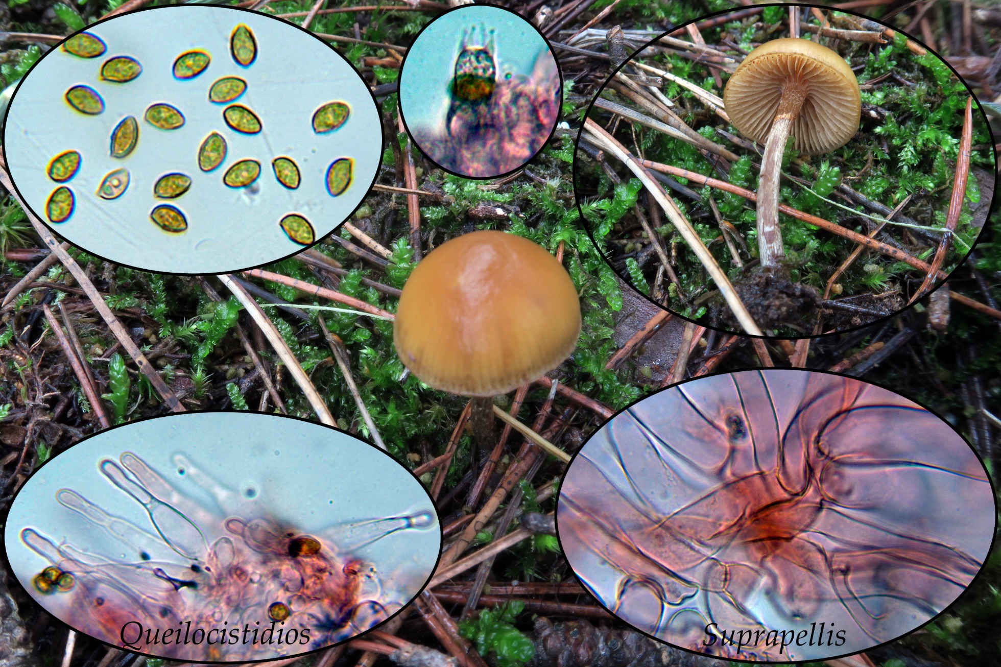 Un hongo muscícola que por su belleza me despistó, con los datos de su microscopía tuve que determinar que se trataba de la abundante (pero muy vistosa) Cystoderma amianthinum