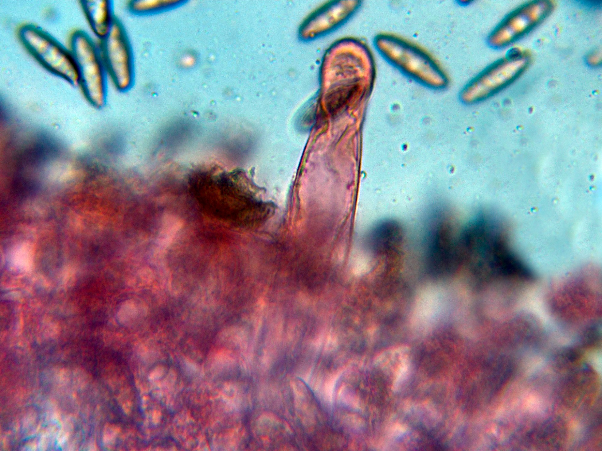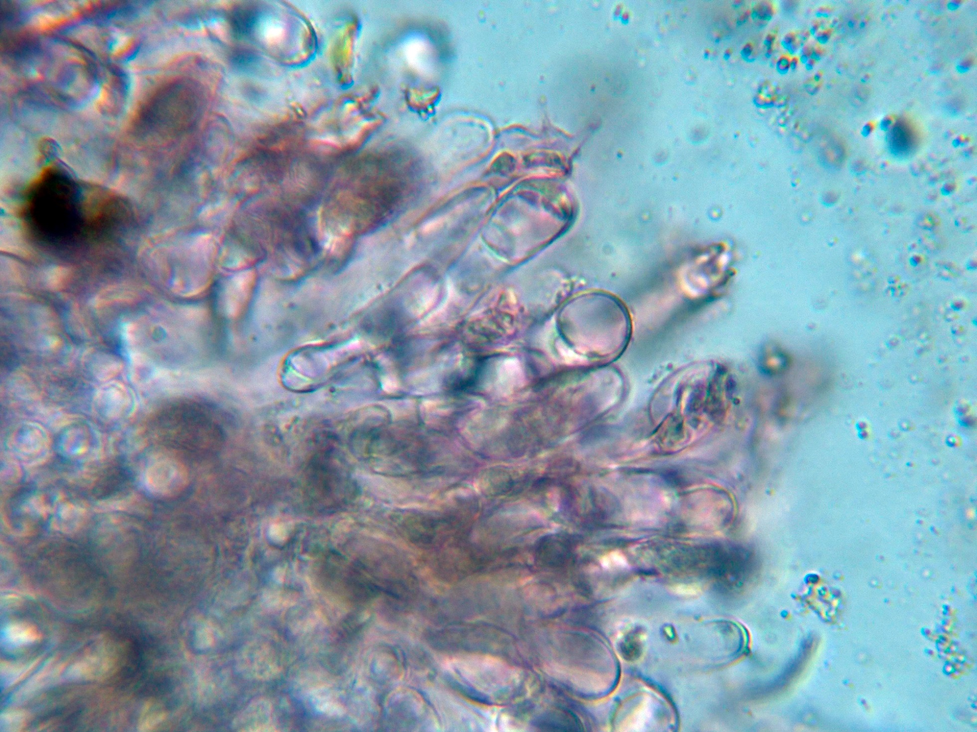 Queilocistidios cilíndricos, con forma de puro y cubiertos por una sustancia amorfa.