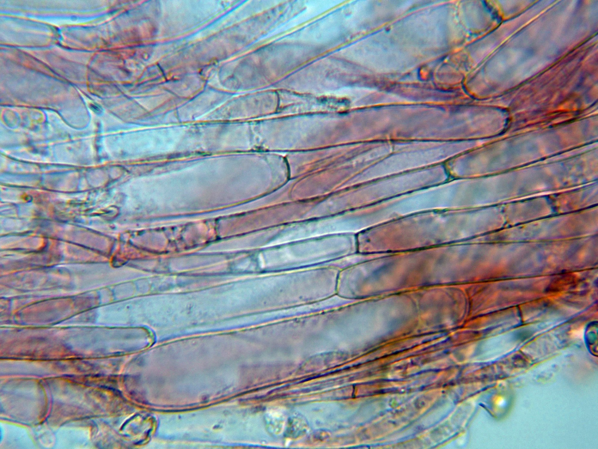 Parte alta del pie con caulocistidios ensanchados en el ápice, con tendencia a capitados.