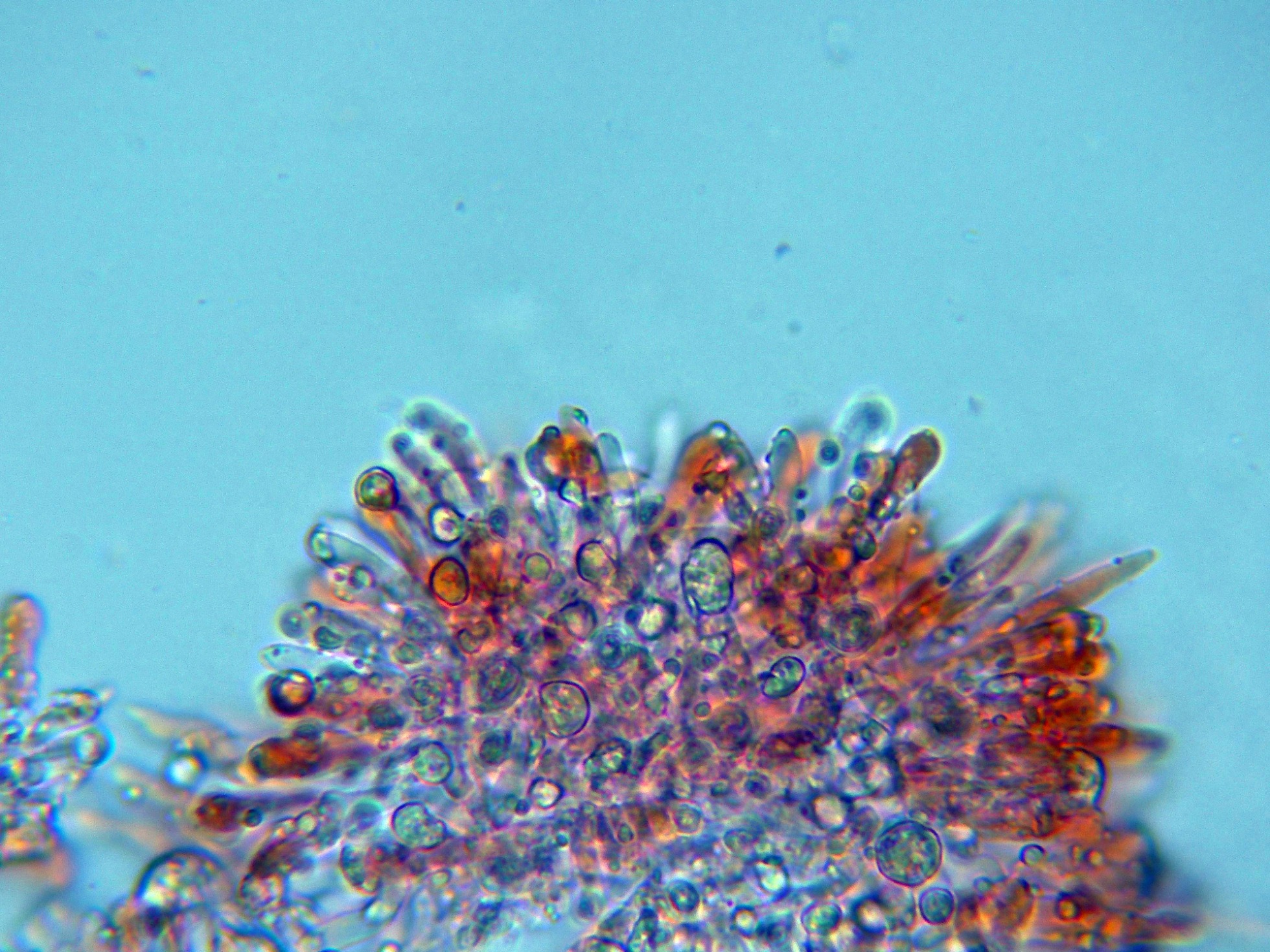 Aunque la especie carece de cistidios, si que presenta cistidiolos subulados dispersos entre los basidios.