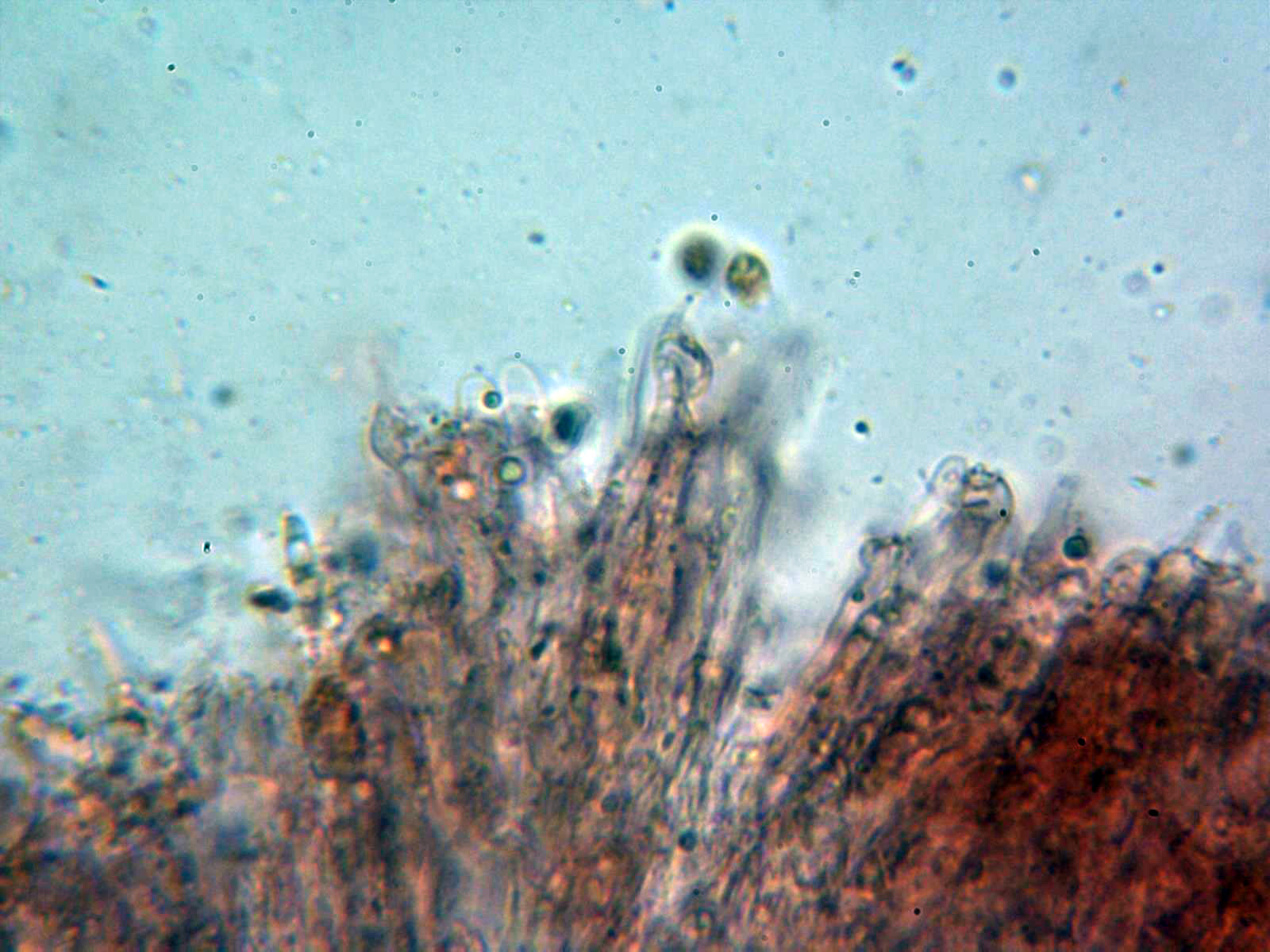 Poco a destacar en su microscopía sin cistidios que se pudieran diferenciar claramente de los basidios o basidiolos, en todo caso unas pocas hifas estériles estrechas y filiformes que sobresalían muy poco por encima del himenio. Hifas del contexto hialinas ramificadas en ángulos rectos y con gruesas fíbulas.