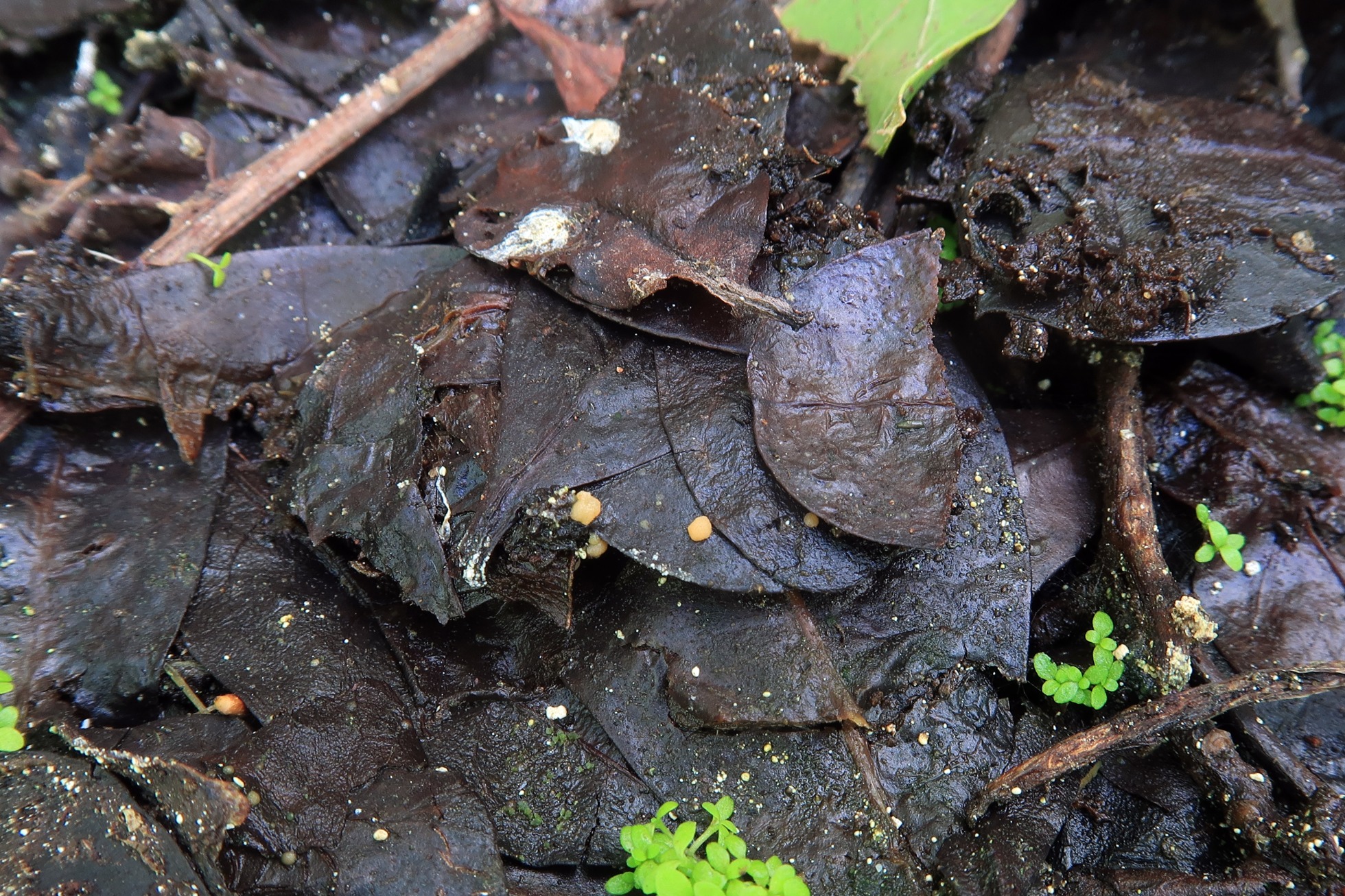 Unos apotecios fotografiados el 11 y el 23 de febrero de 2023, en el espacio natural de "Laguna Bávaro", brotando de manera dispersa sobre unas hojas del suelo semisumergidas y en proceso avanzado de descomposición, pertenecientes probablemente a alguna variedad de manglar sin determinar.