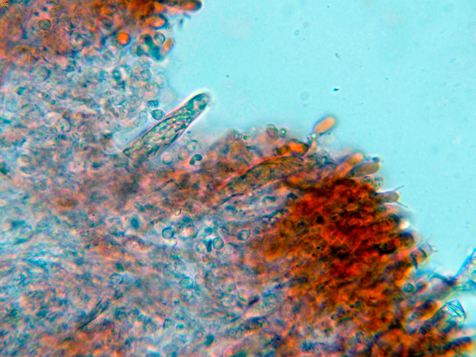 Cistidios ahusados abundantes en el himenio, con contenido en su interior (gloeocistidios).