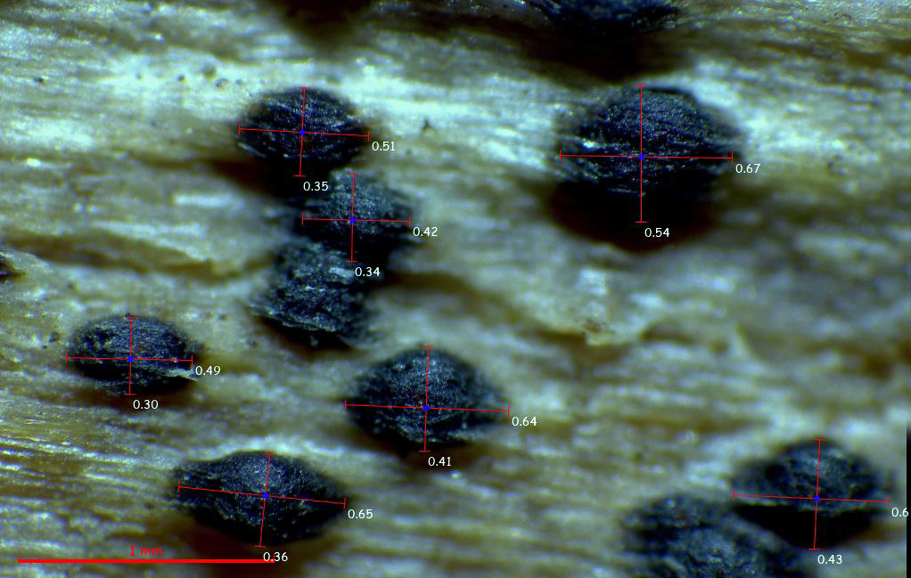 Para terminar añado una comparativa de los ascomas del Exarmidium inclusum y del Exarmidium del presente estudio a la misma escala, a mi propuesta la he llamado Exarmidium JTP 1938/23, que se corresponde con el número del herbario.