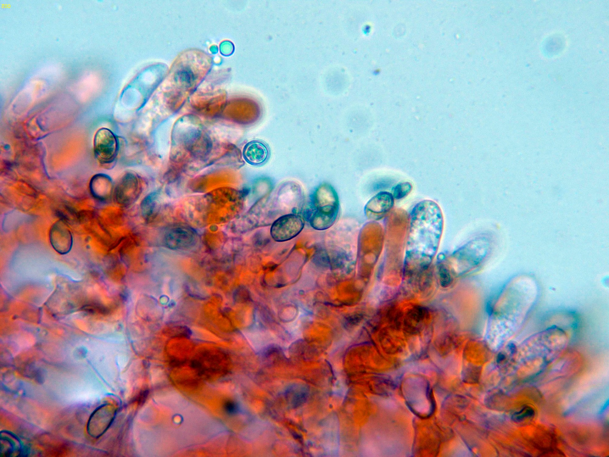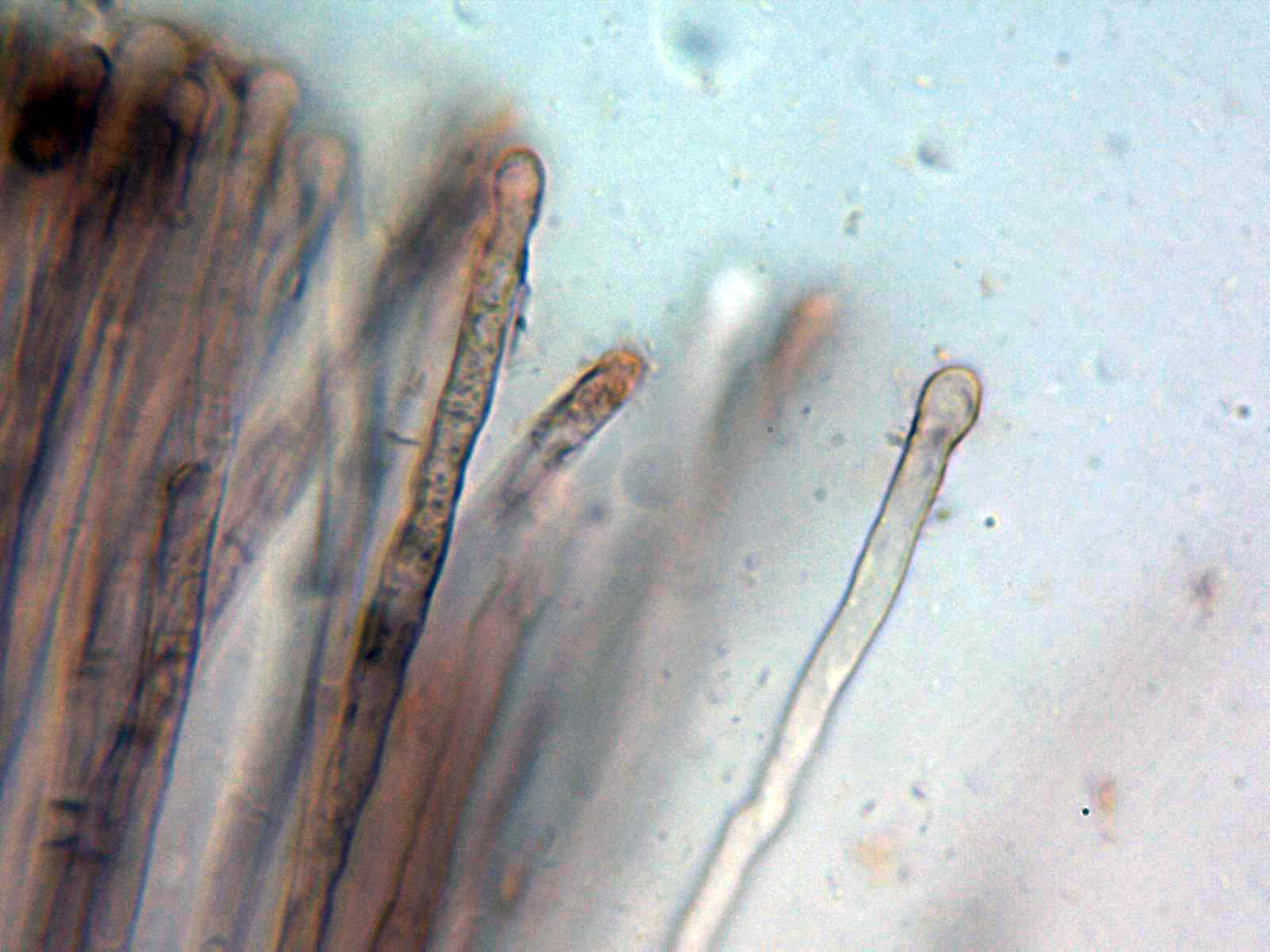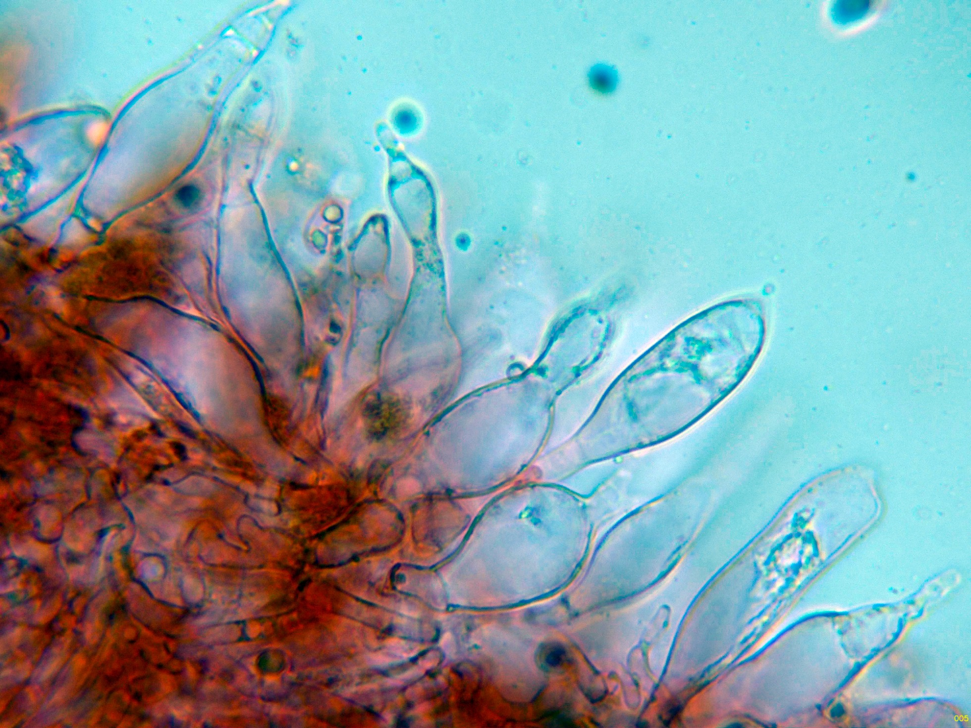 Con el Rojo Congo no pude observar claramente los gloeocistidios causantes del sangrado del basidioma, por lo que decidí probar simplemente con agua, en este medio ya los pude ver con claridad: