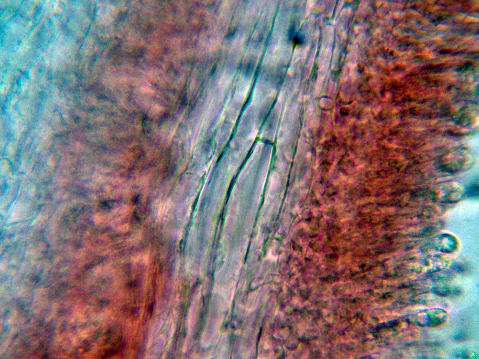 La pileipellis en agua, con hifas provistas de fíbulas: