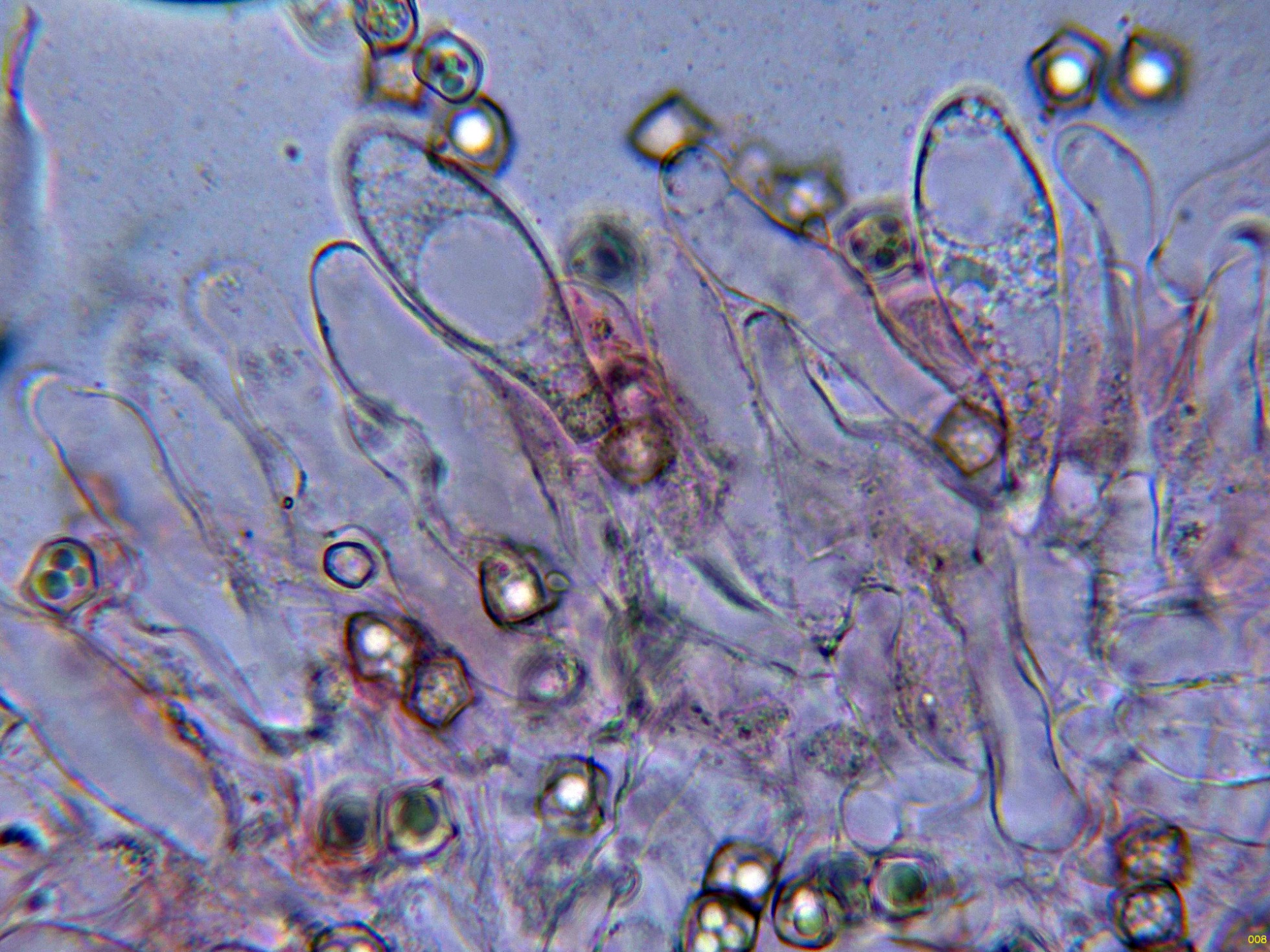 Aunque no se citas queilocistidios para la especie, si que he podido observar en la arista laminar una buena cantidad de hifas estériles a modo de basidiolos, mezcladas con los basidios, con un tamaño ligeramente por debajo de estos.