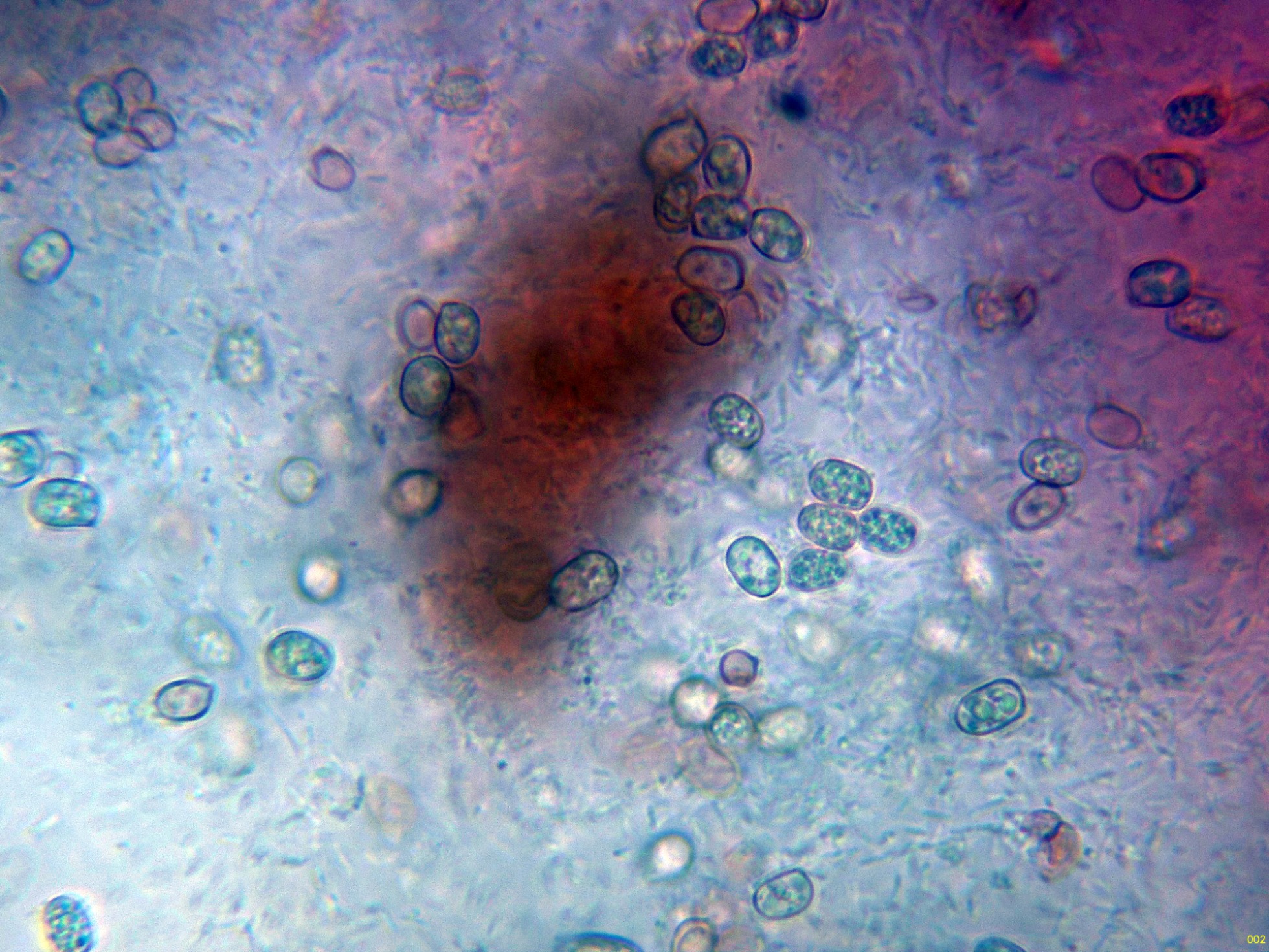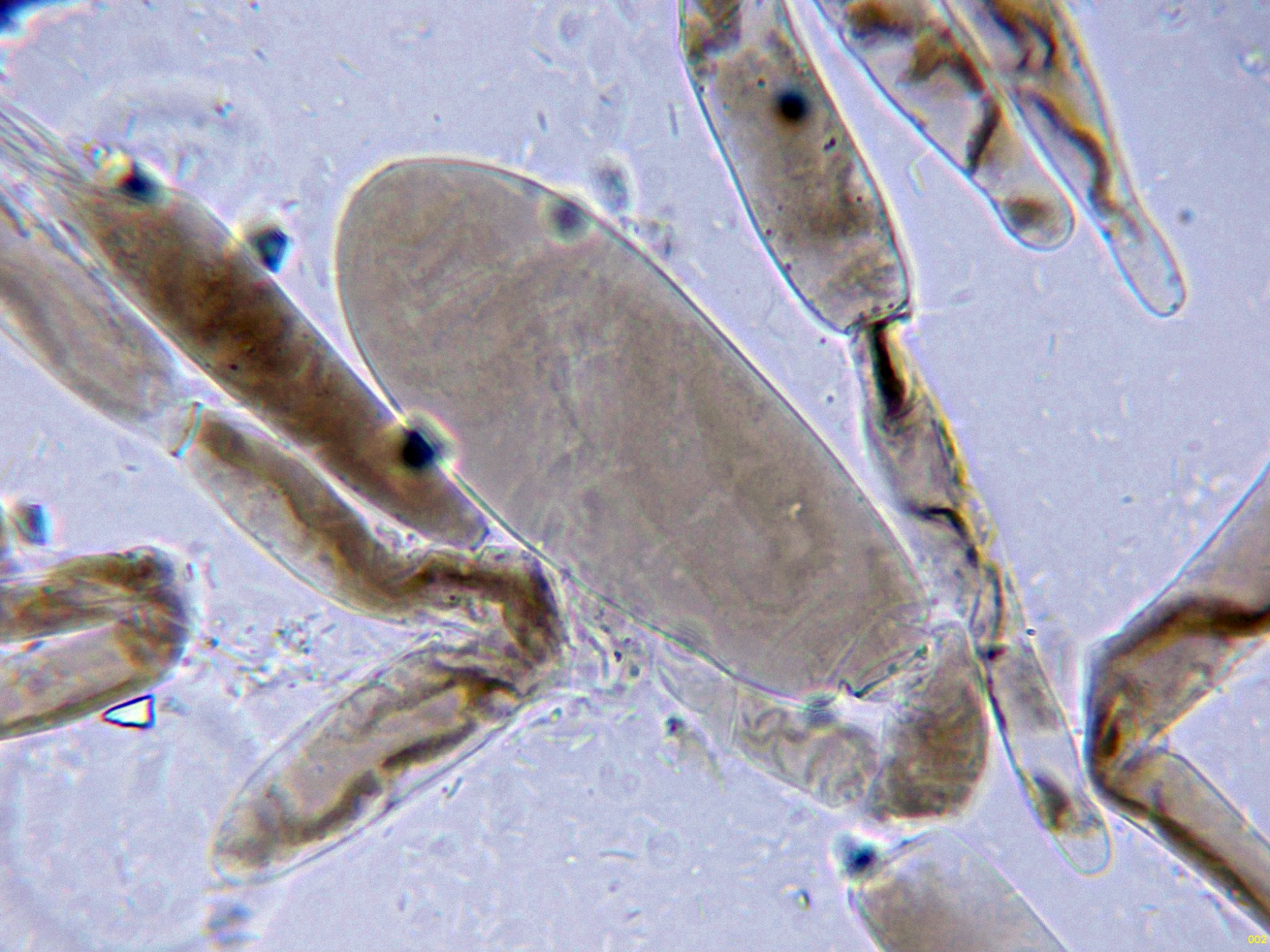 Un Pluteus, que a pesar de estar contaminado por bacterias, teniendo en cuenta su arista laminar que parece coloreada y sus queilocistidios con 3 cuernos, todo apunta al Pluteus tricuspidatus, actualmente Pluteus atromarginatus.
