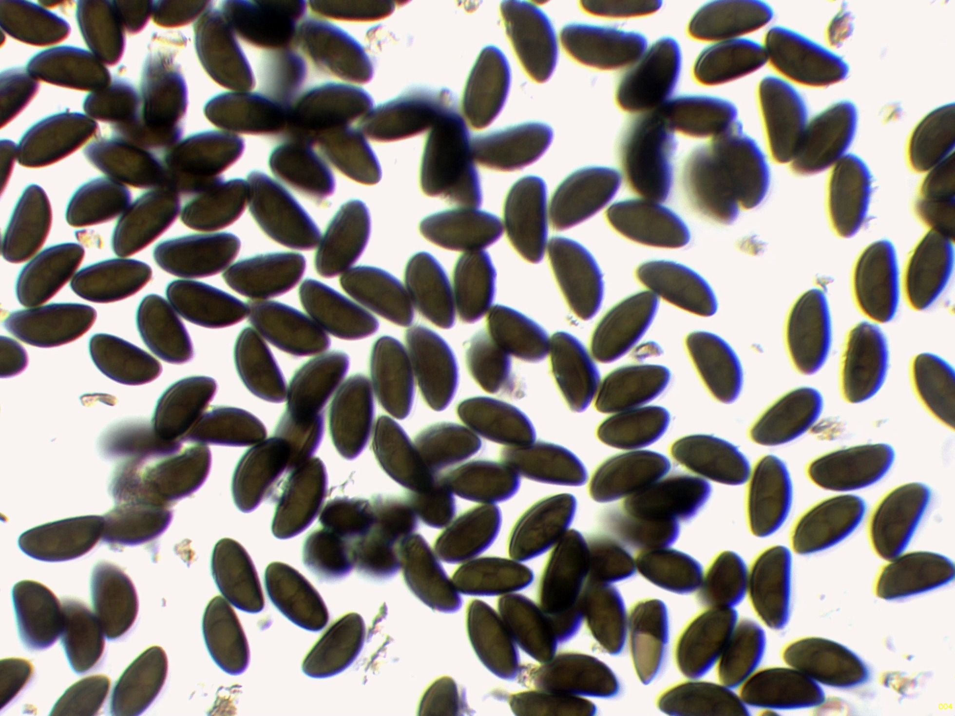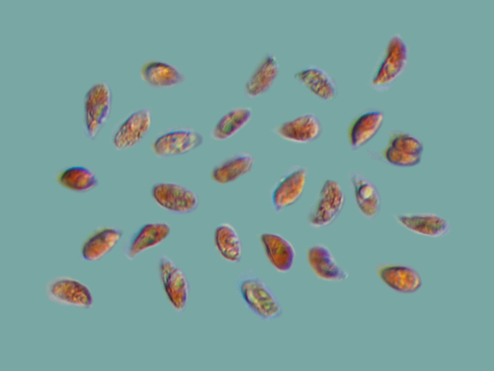 Unas pocas esporas en reactivo de Melzer, con un comportamiento inamiloide: