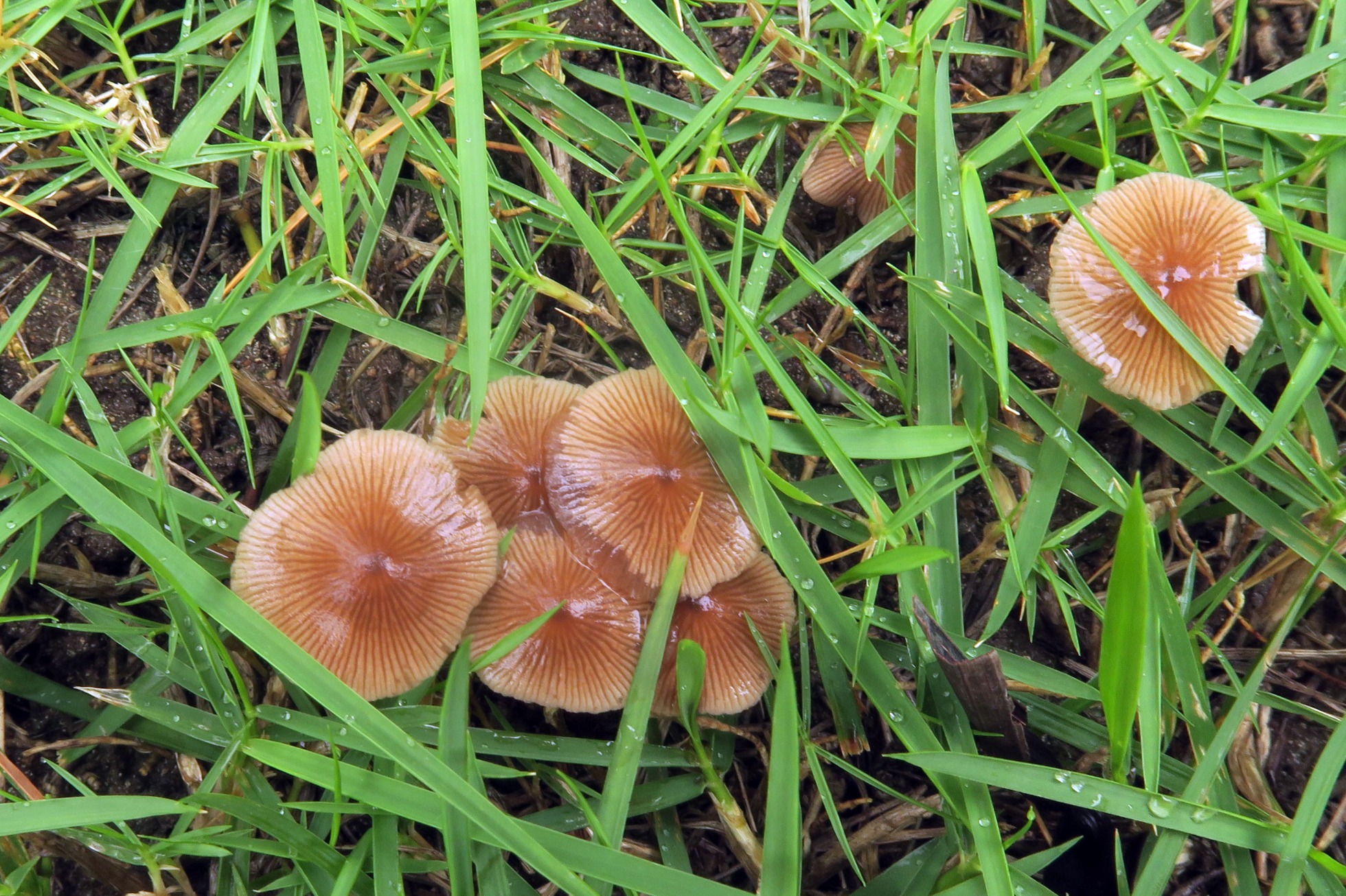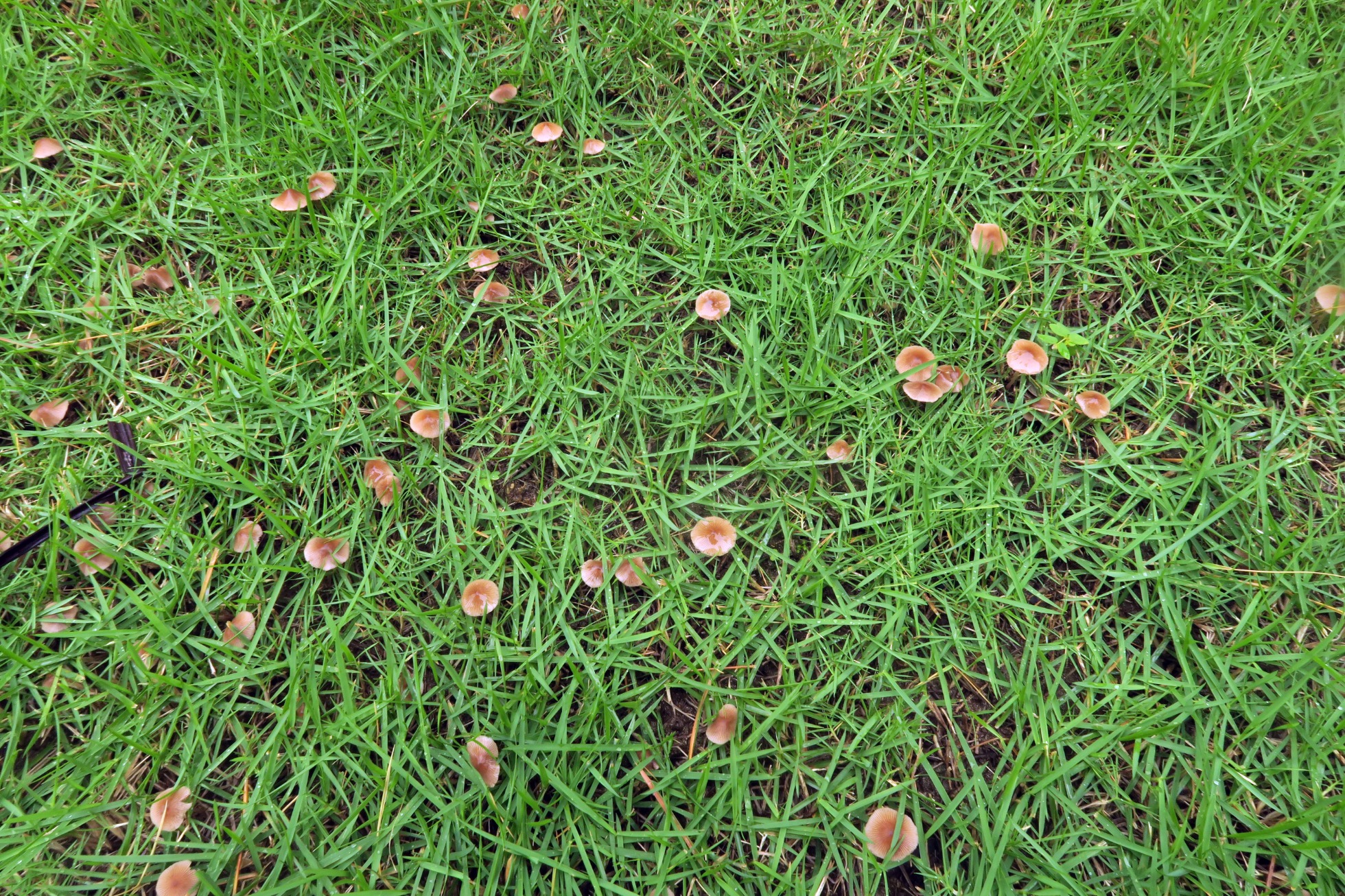 Una Psathyrella de pequeño tamaño, que aparece a menudo por el jardín de mi casa, sin pleurocistidios (Candolleomyces), no me cabe duda de que se trata de una nueva especie aún no descrita, siempre la he llamado como lo más parecido que existe actualmente, es decir Candolleomyces aff. sulcatotuberculosus, admito que jamás la había visto brotar de manera tan abundante, quizás algún día me decida a secuenciar esto: