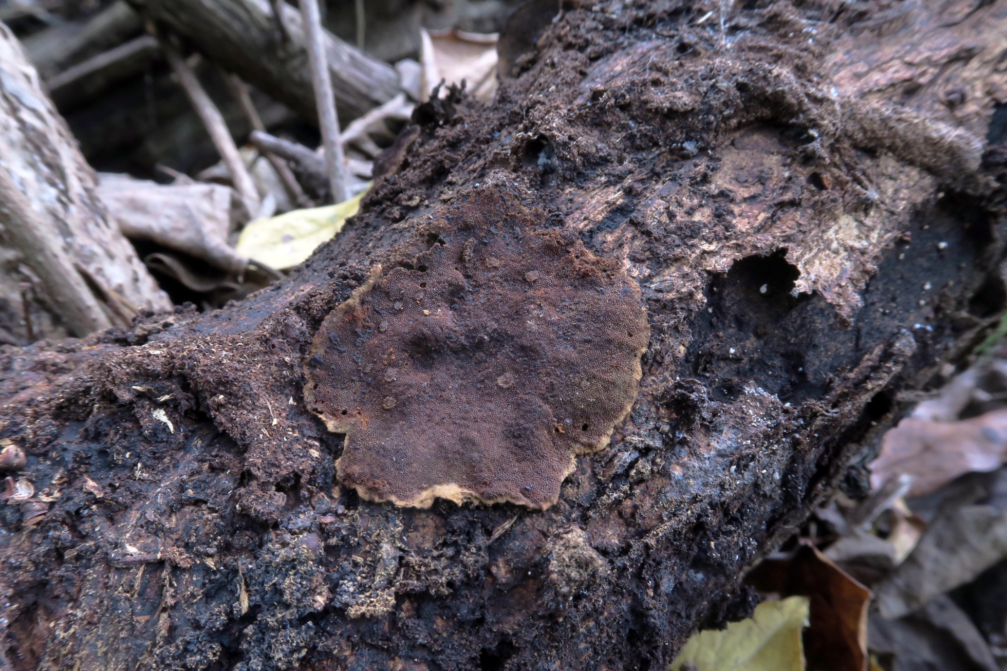 Un Polyporal con aspecto de Phellinus, brotando sobre la superficie de un tronco tumbado del suelo, fotografiado el 21 de julio de 2022, en la República Dominicana.