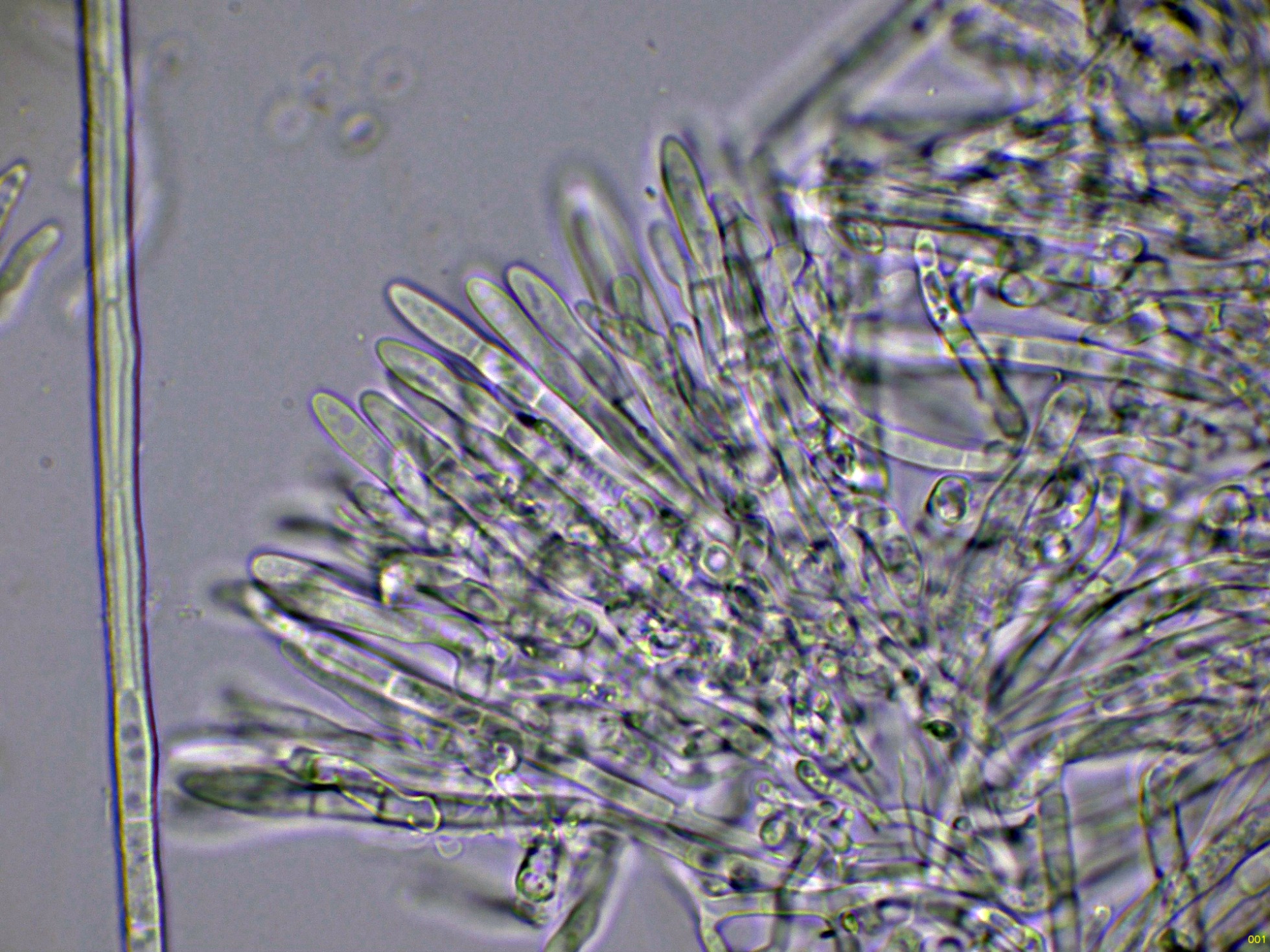 Observaciones: Siguiendo las Claves Europeas de Lachnum de que disponemos, con uncínulos, hábitat sobre madera, esporas de menos de 12 micras de largo, pelos marginales de 70 a 110 µm., ascos con unas medidas de 48-70 µm de largo y paráfisis sobresaliendo 3-20 µm. por encima del nivel de los ascos me conducen a un tal Lachnum cf. crataegi, sin embargo con pelos más cortos, según las Claves de 50-85 µm de largo., con ascos más cortos de 43-55 µm de largo, más acordes con mis mediciones y paráfisis sobresaliendo 15-30 µm. por encima del nivel de los ascos con una anchura de 4,5-7 µm. me conducen al ya más abundante Lachnum fasciculare, así que tenemos que por las medidas de los pelos marginales se trataría de Lachnum cf. crataegi, y por las medidas de los ascos de Lachnum fasciculare, ante las muy sutiles diferencias entre ambas, y teniendo en cuenta lo muy discutido que puede llegar a ser el taxón del Lachnum cf. crataegi, lo dejo en mis archivos como Lachnum fasciculare sl.