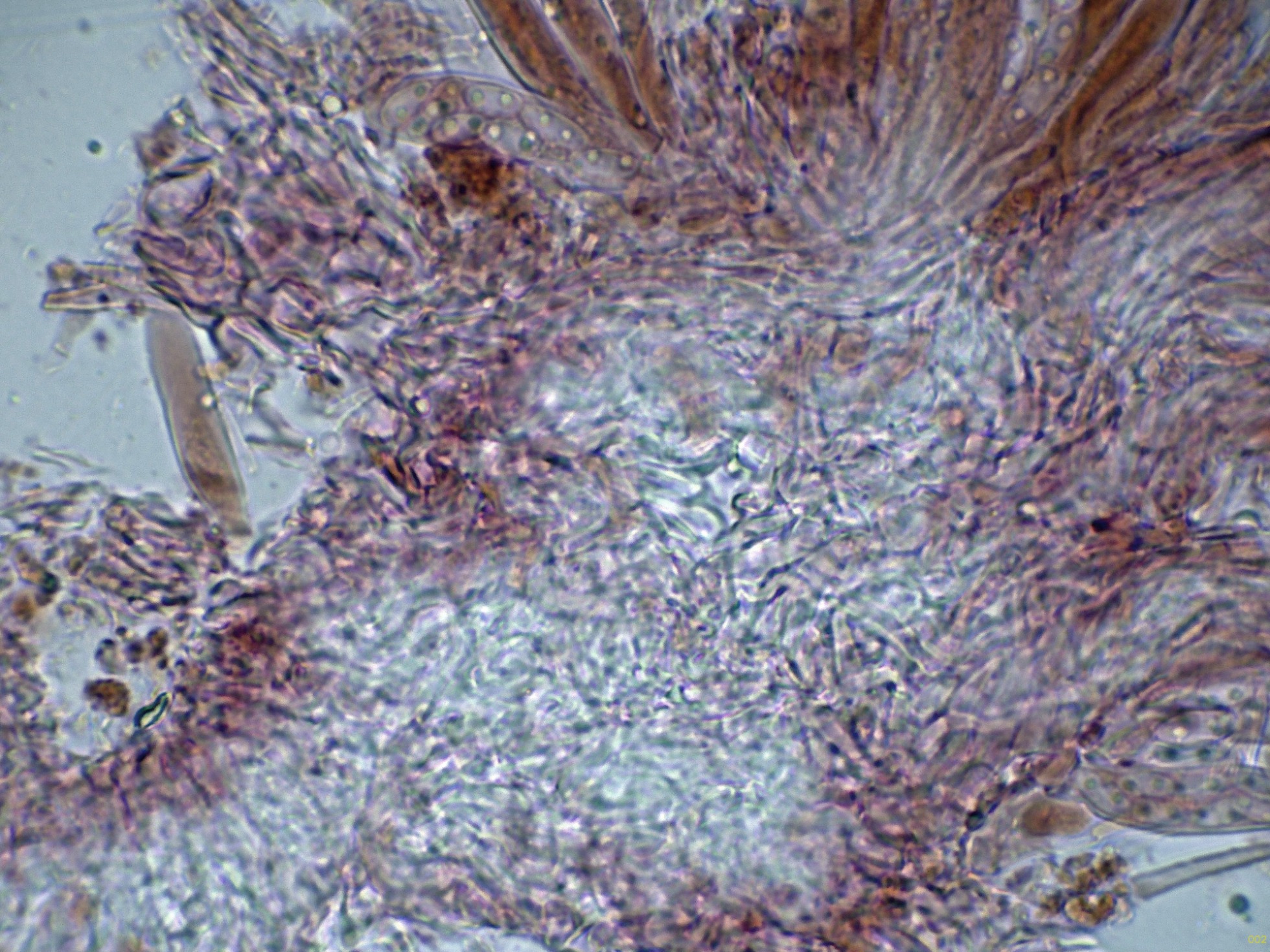 Hifas del excípulo medular intricadas y por debajo de estas unas hifas ya con tendencia a globoso angularis.