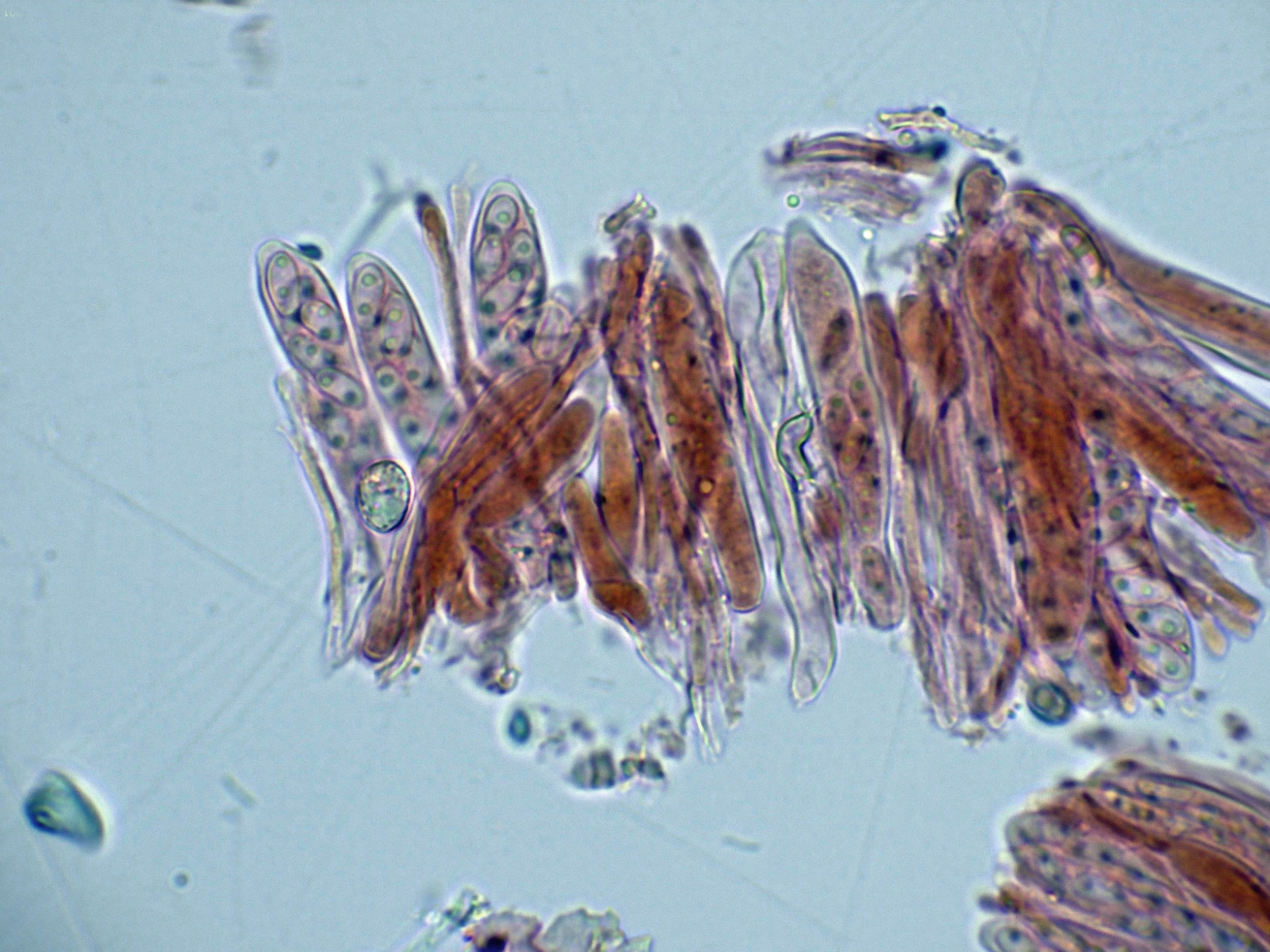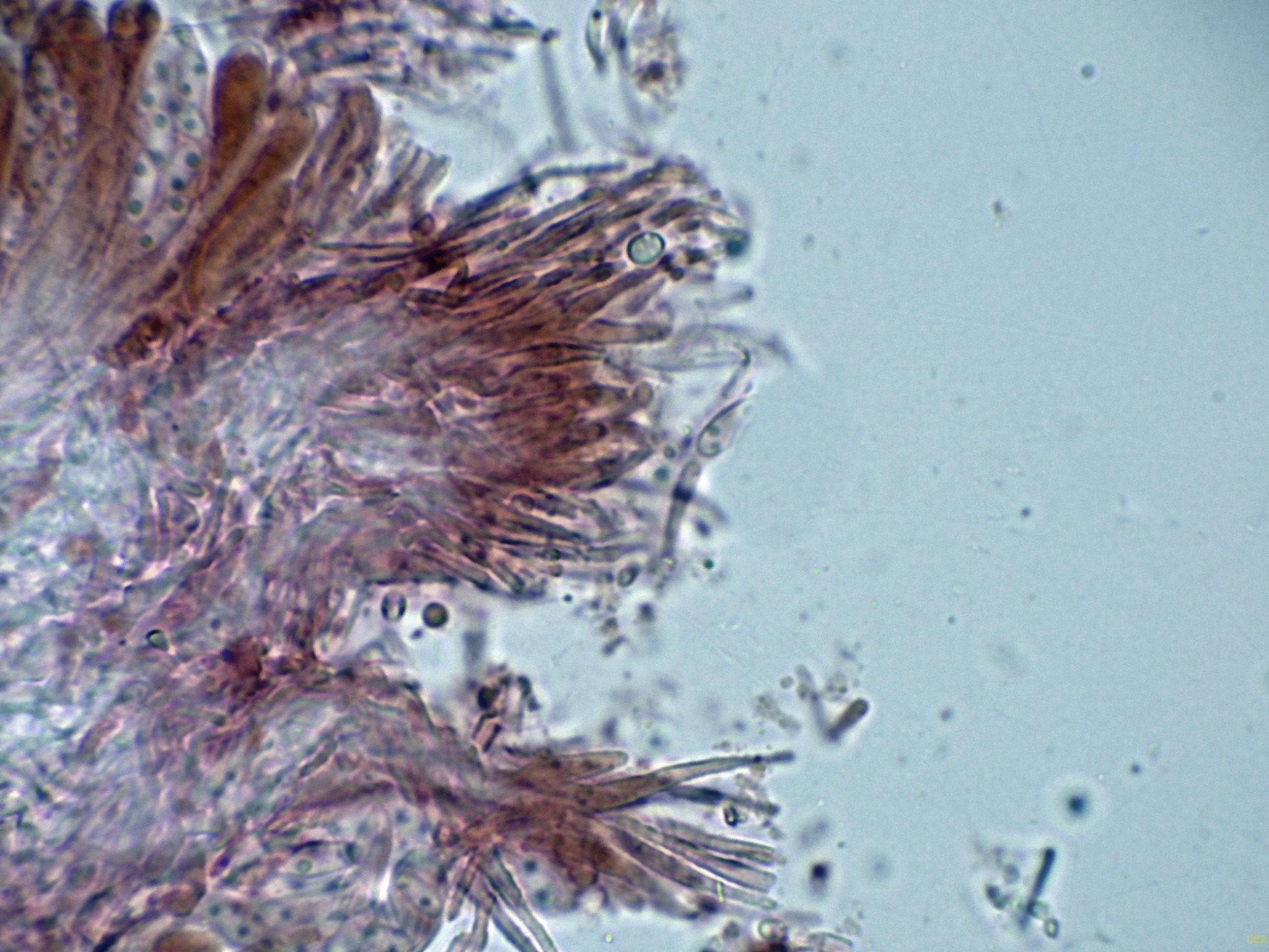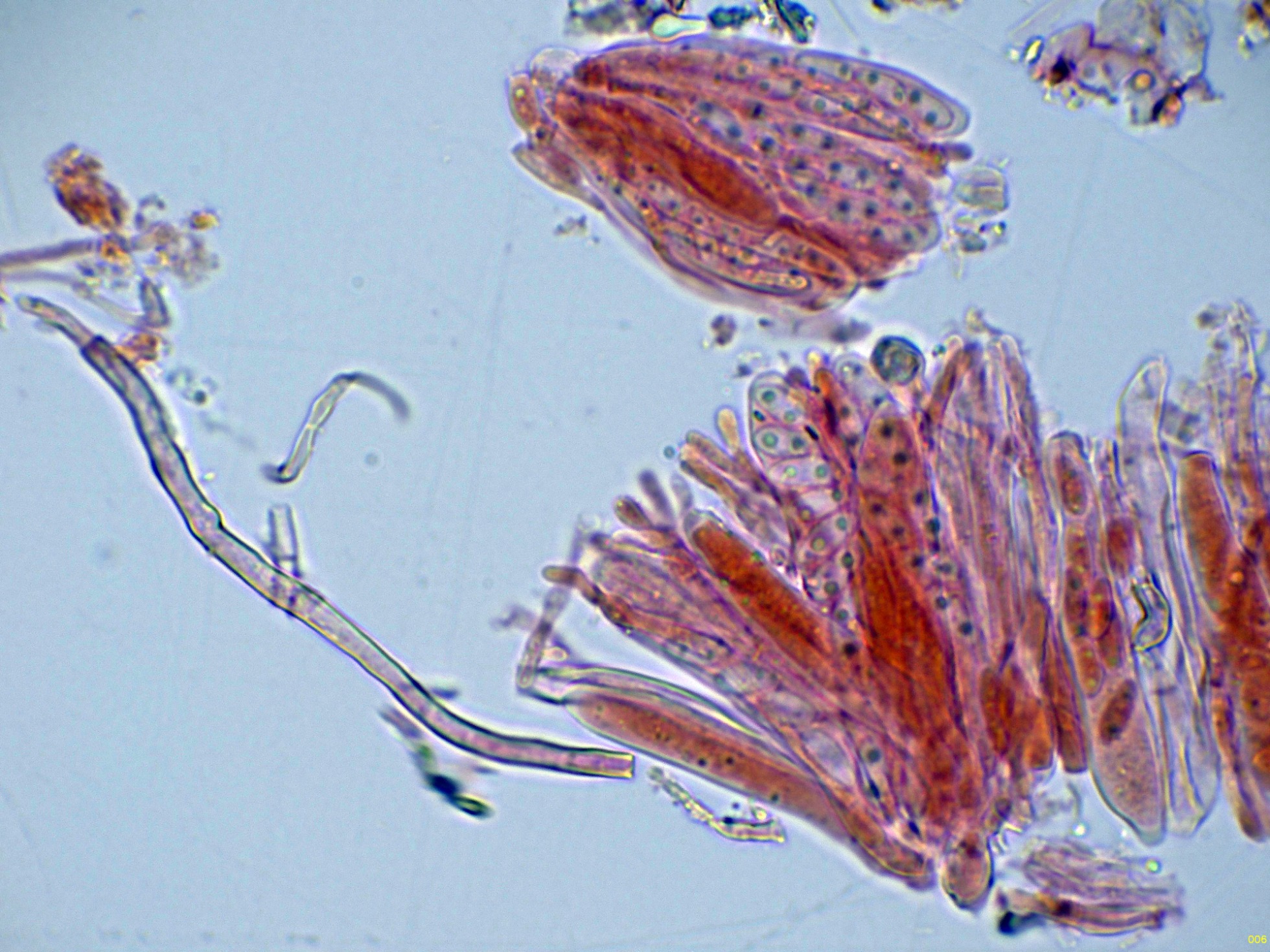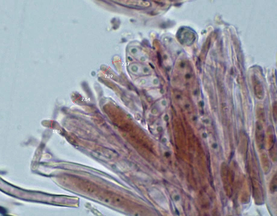 Paráfisis filiformes, poco o nada ensanchadas en el ápice, que no sobresalen por encima del nivel de los ascos, con uno o dos septos y una anchura de 2 a 2,55 micras.
