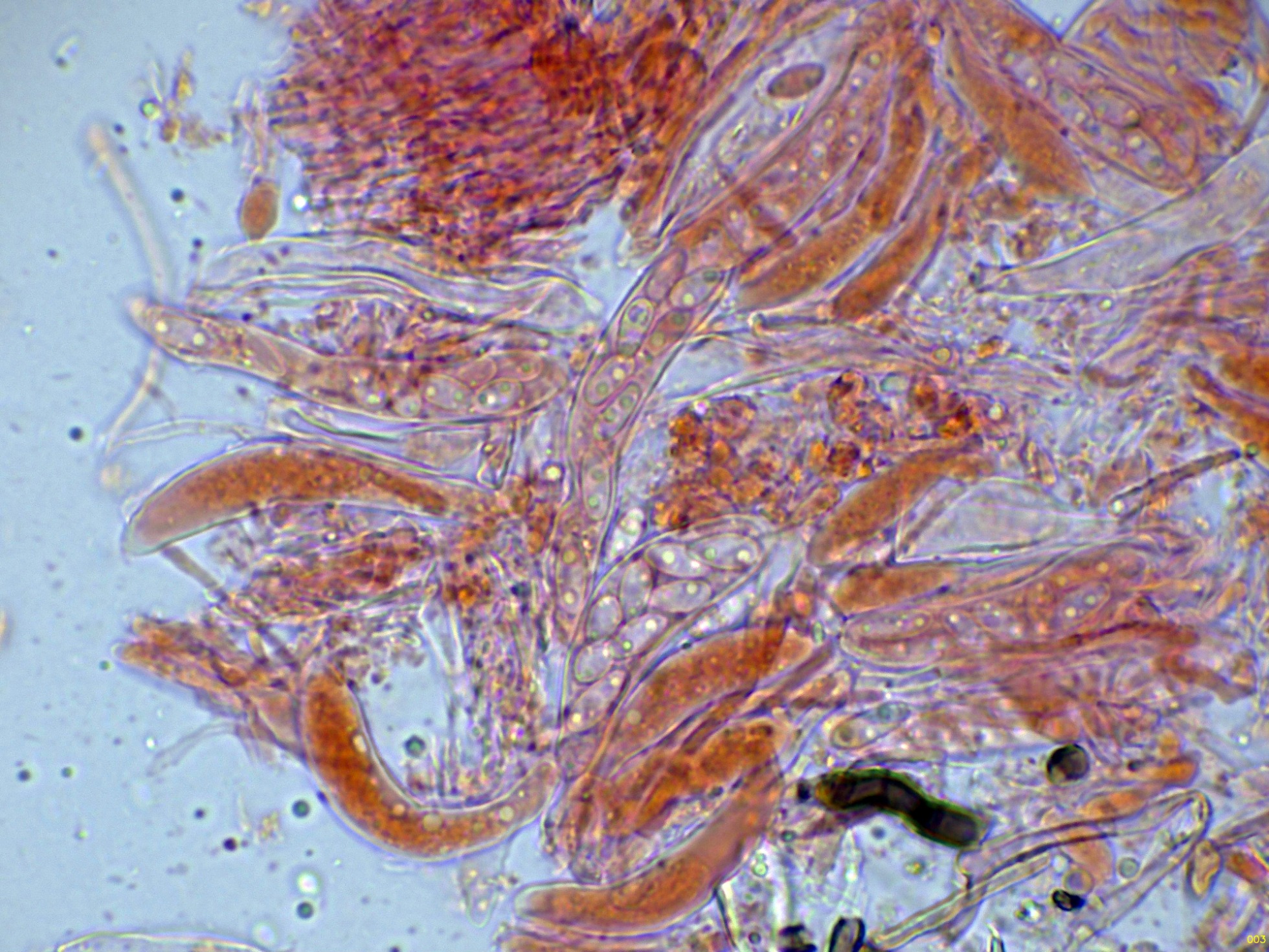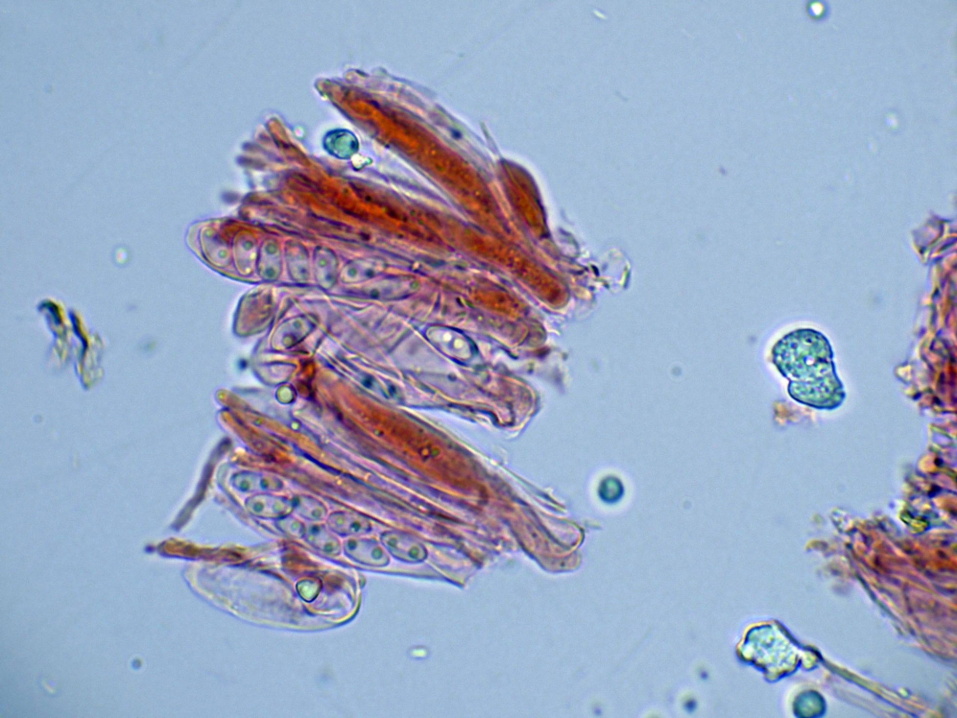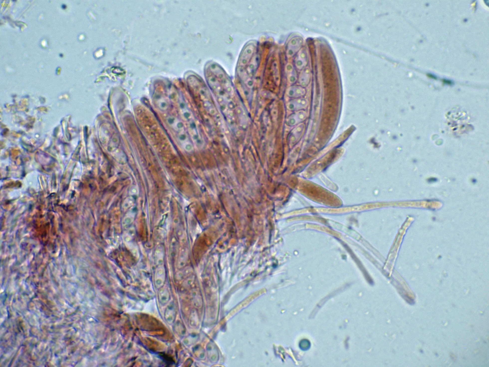 Paráfisis filiformes, poco o nada ensanchadas en el ápice, que no sobresalen por encima del nivel de los ascos, con uno o dos septos y una anchura de 2 a 2,55 micras.