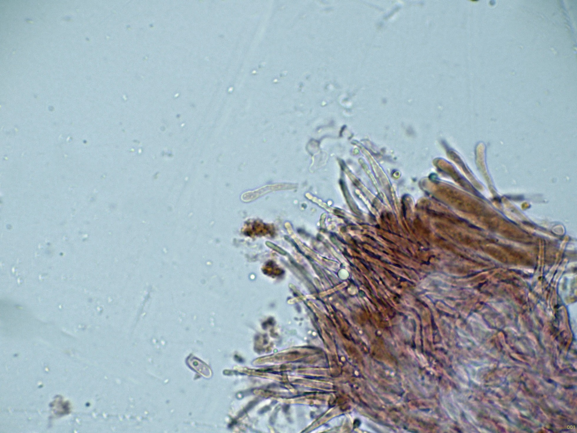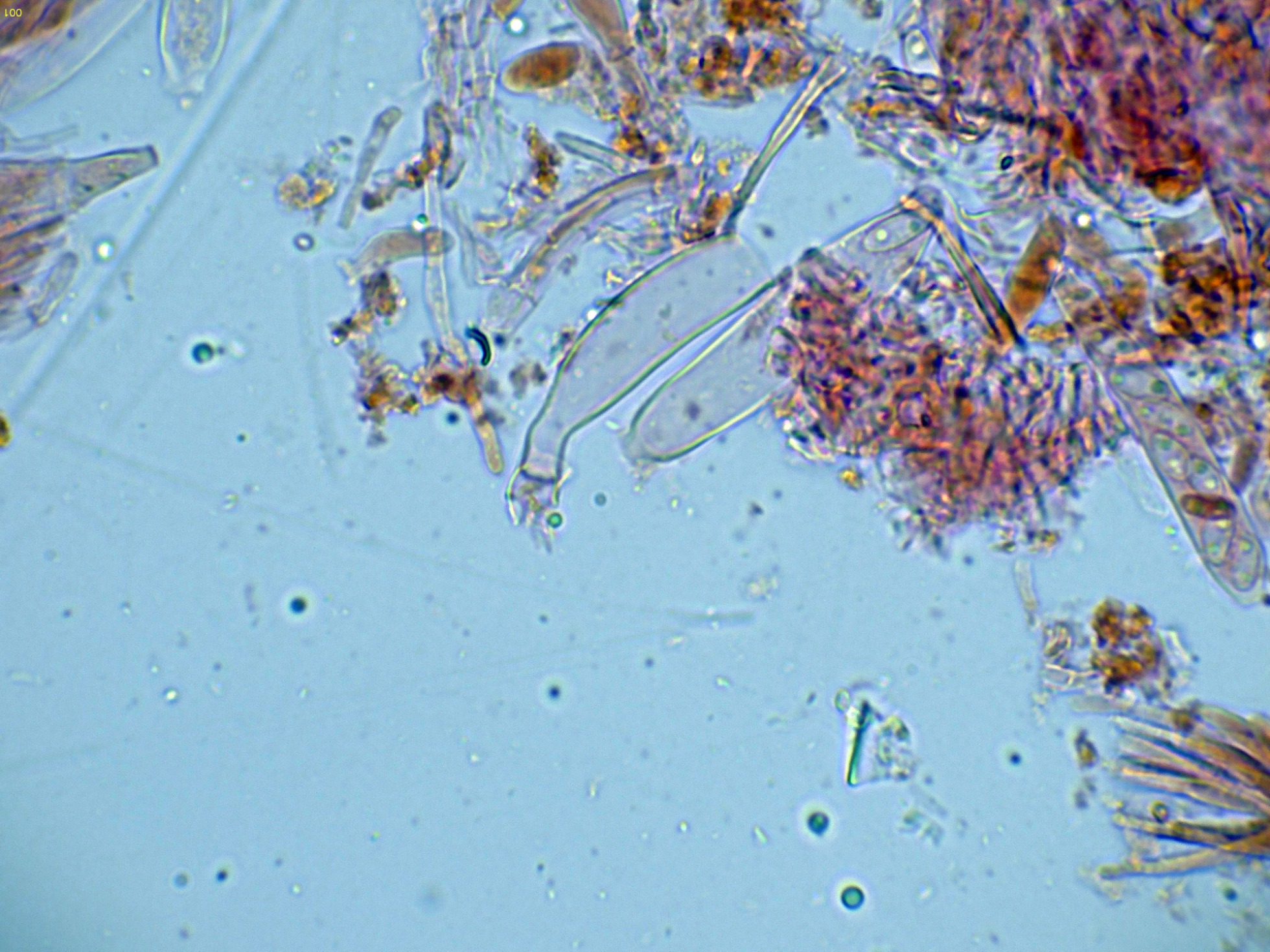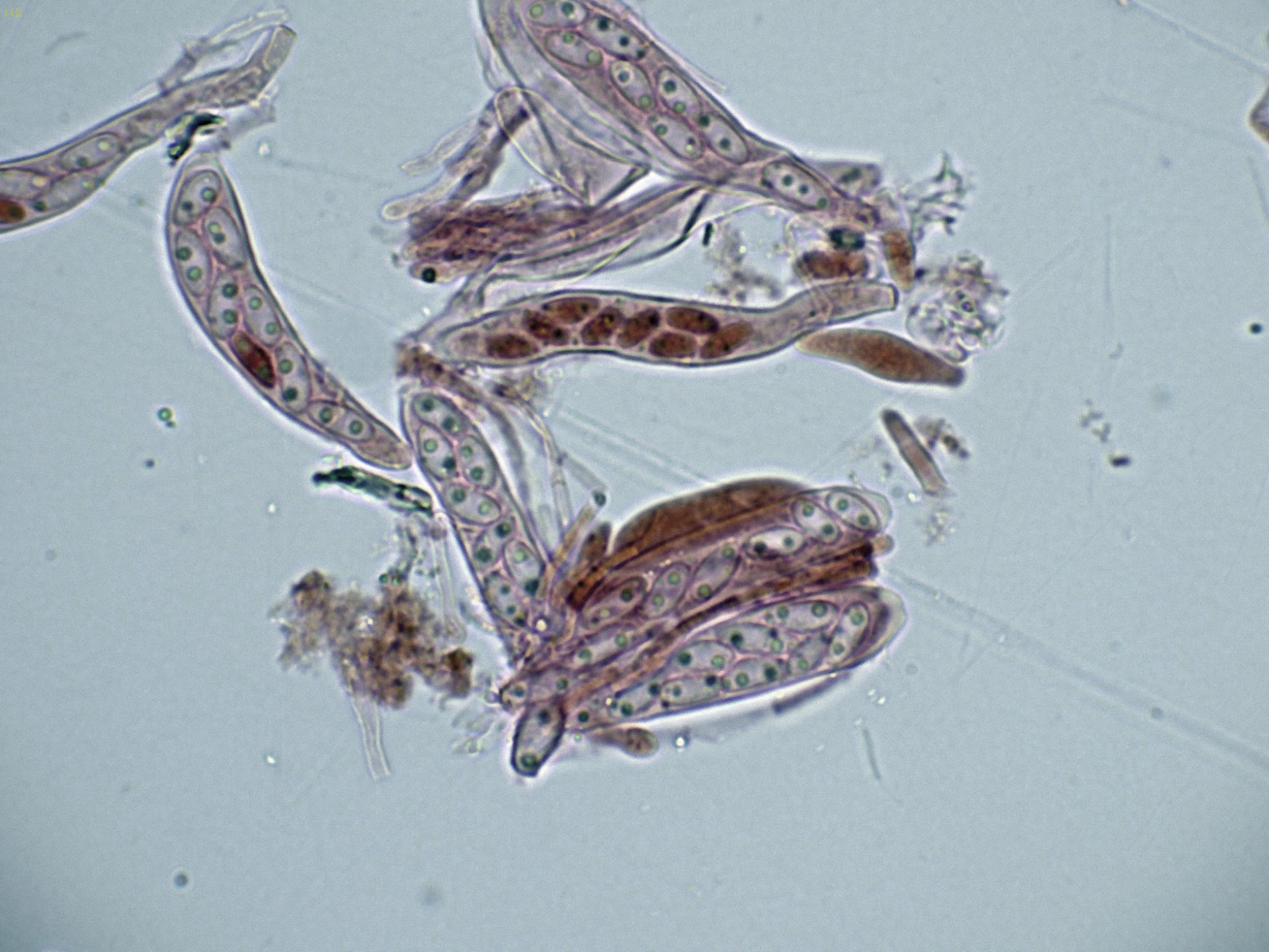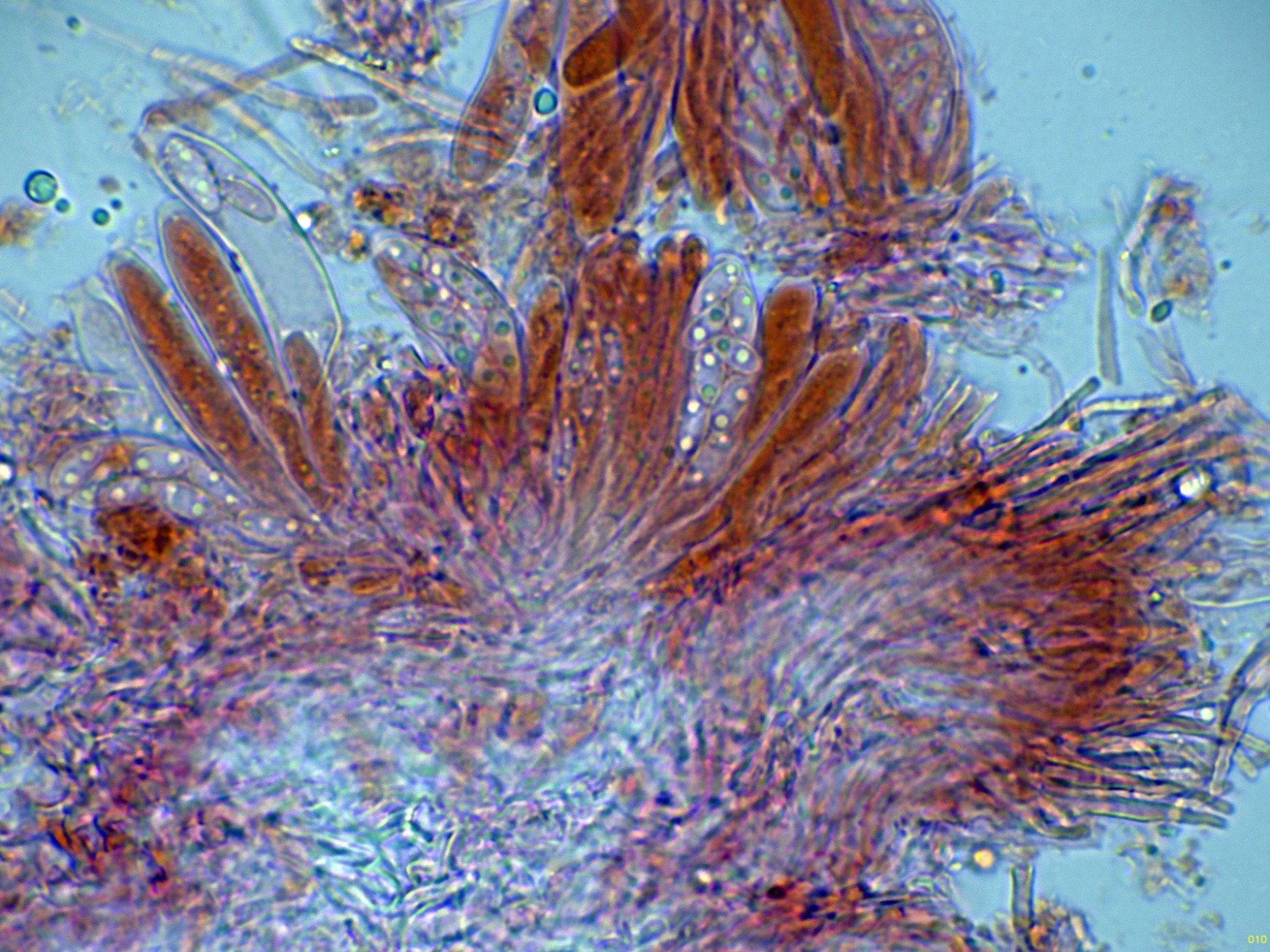 Paráfisis filiformes, poco o nada ensanchadas en el ápice, que no sobresalen por encima del nivel de los ascos, con uno o dos septos y una anchura de 2 a 2,55 micras.
