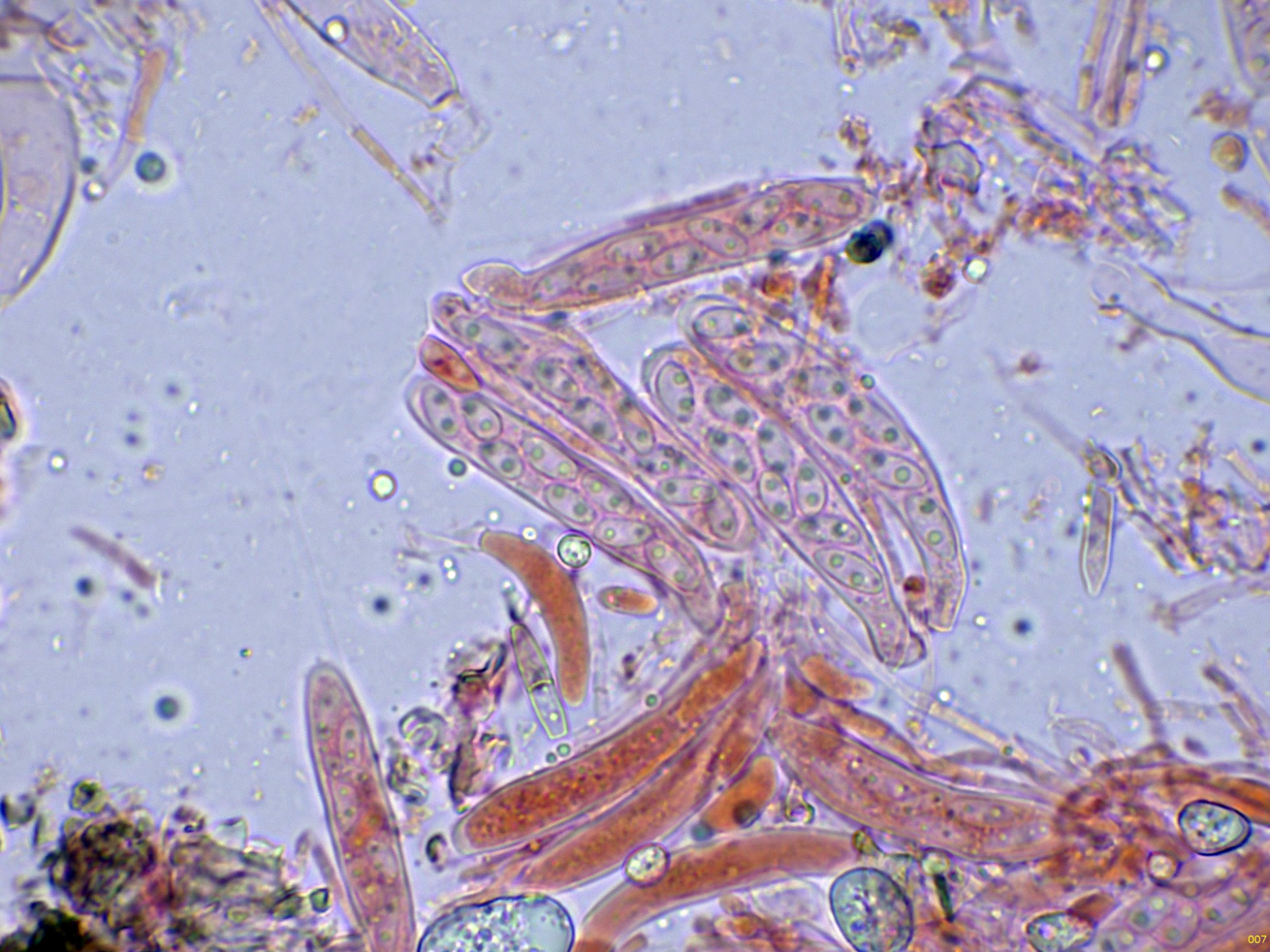 Ascos octospóricos, aparentemente sin uncínulos en su base, mayoritariamente biseriados, y con unas medidas de (35.7) 40.9 - 52 (52.4) × (7) 7.7 - 9.1 (9.6) µm.