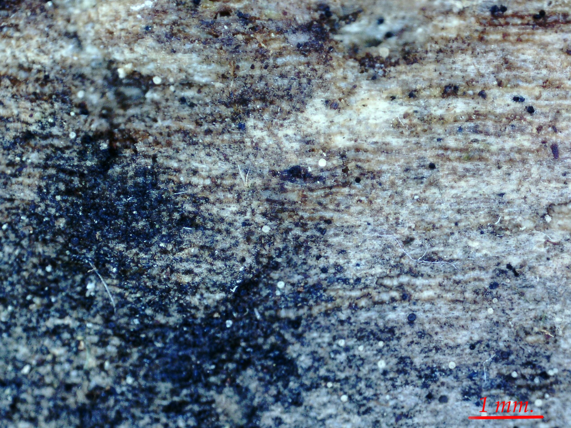 Unos muy diminutos apotecios, brotando de manera dispersa, localizados sobre la superficie de un tronco semisumergido en agua limpia de Fraxinus sp.
