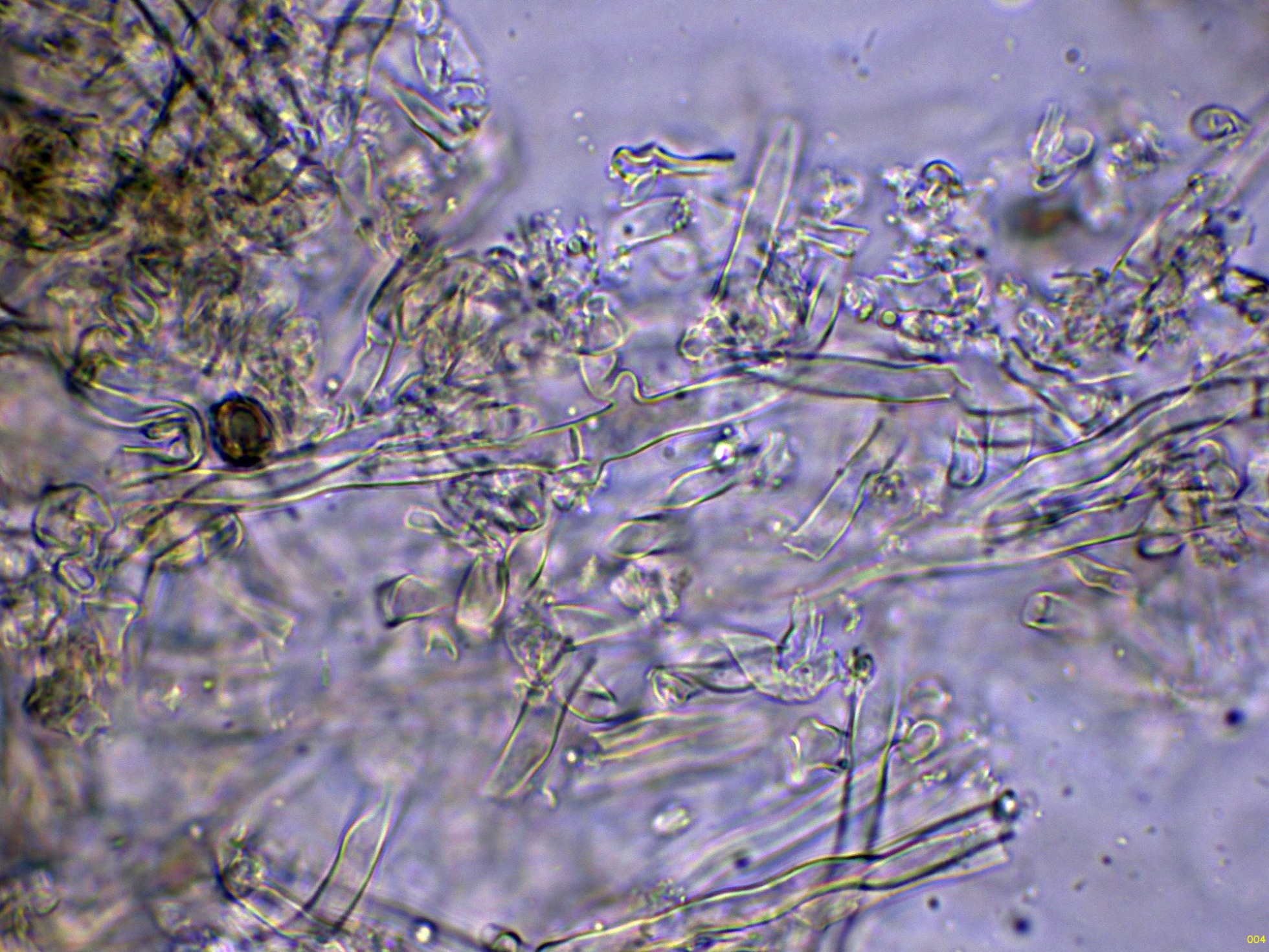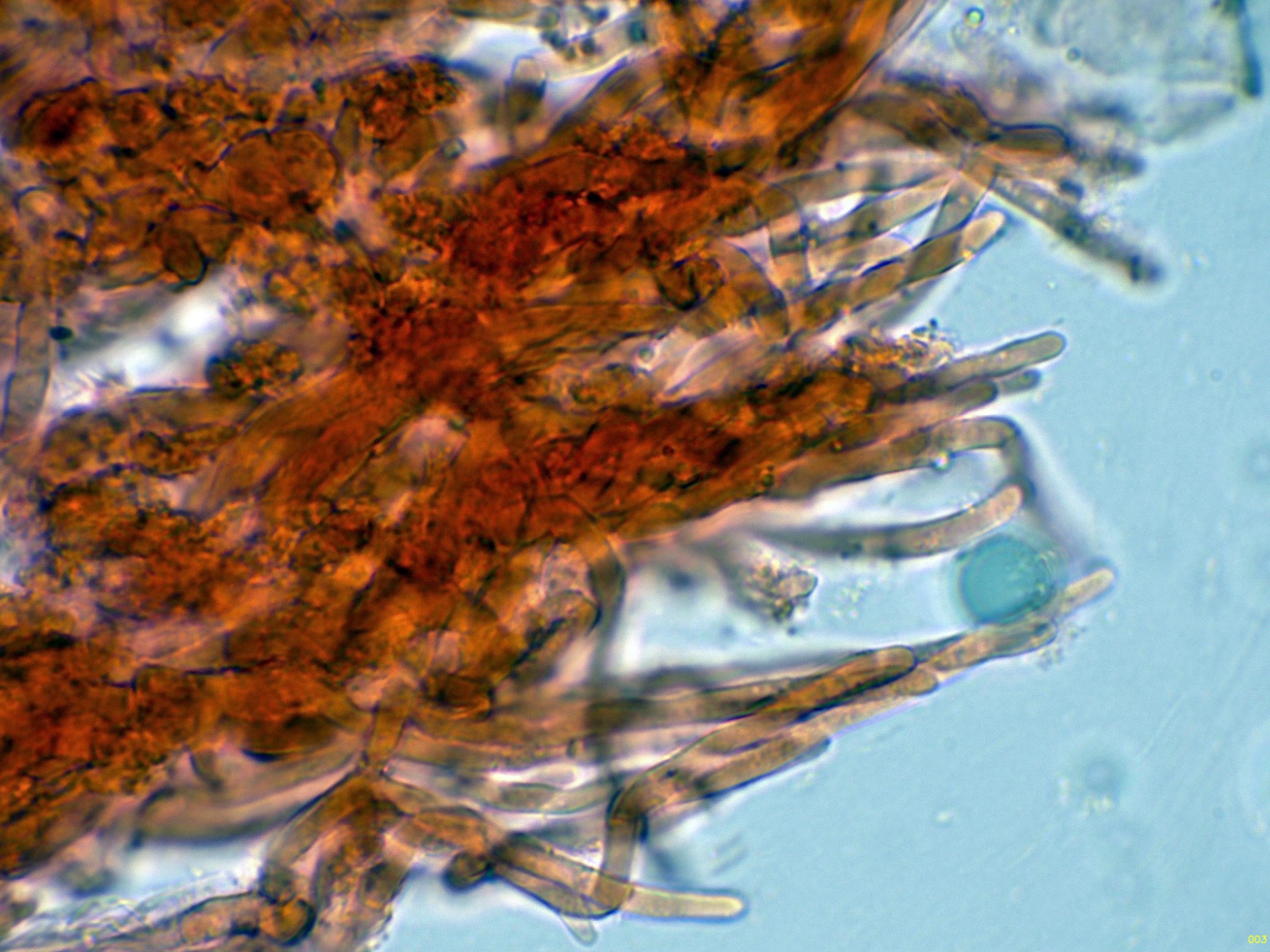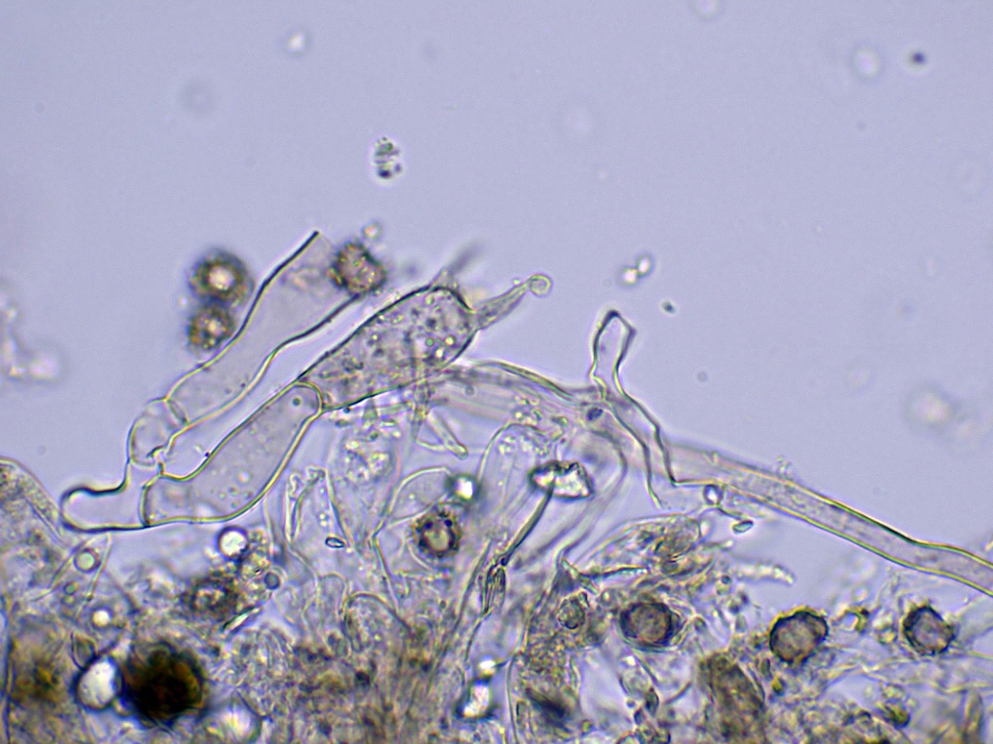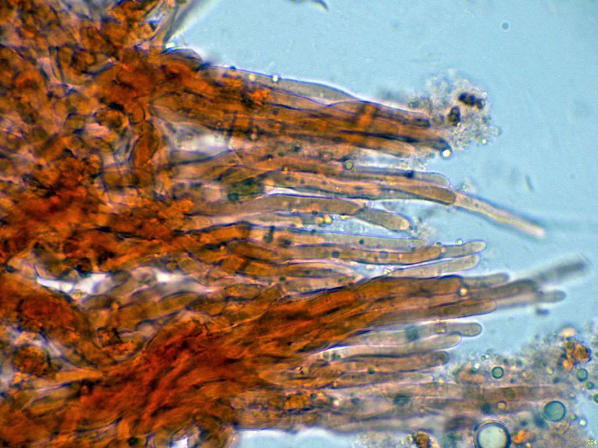 Extremos de las ramificaciones hialinos, curiosamente en estos extremos no pude observar basidios, por lo que los debo considerar estériles.