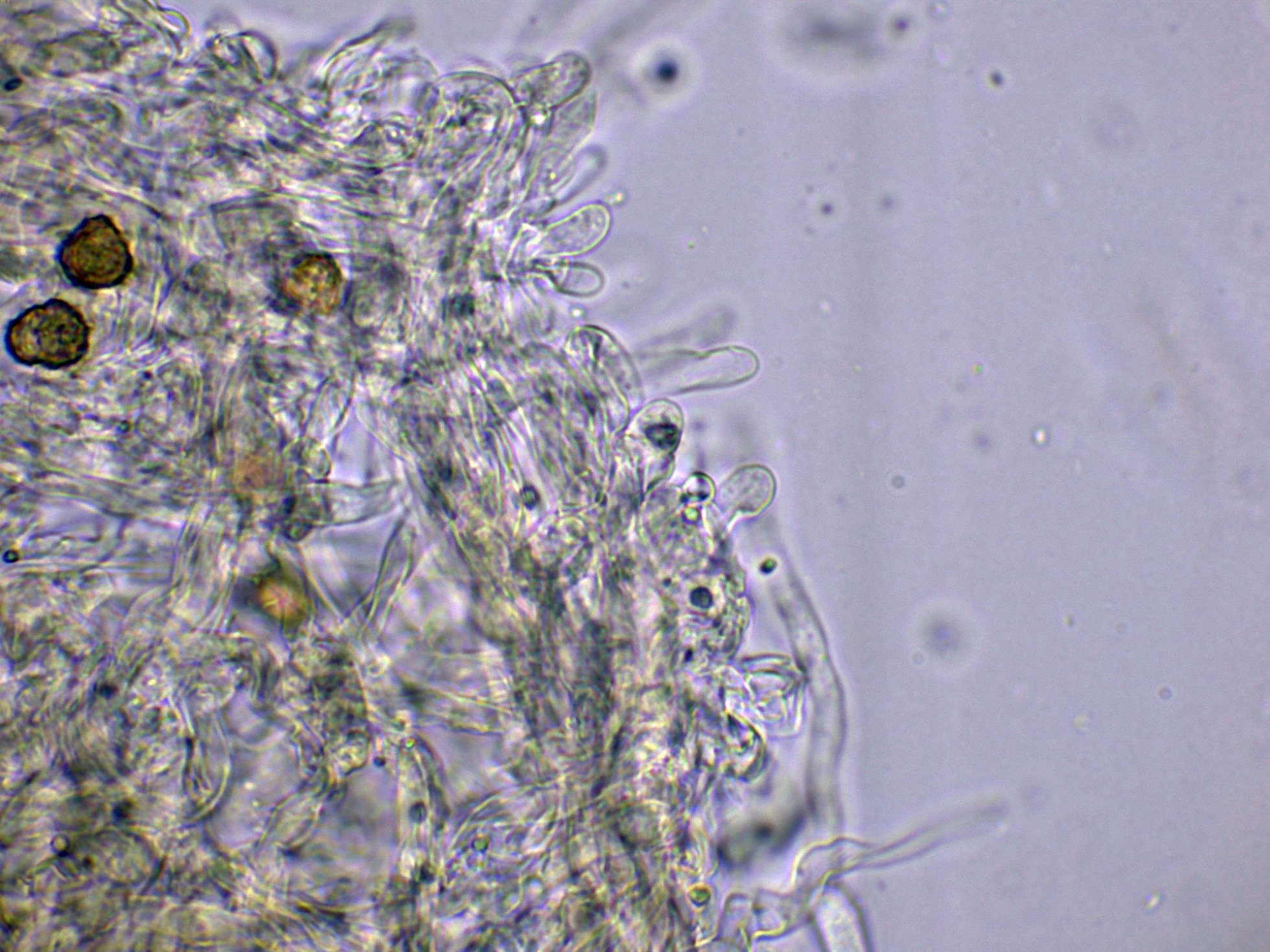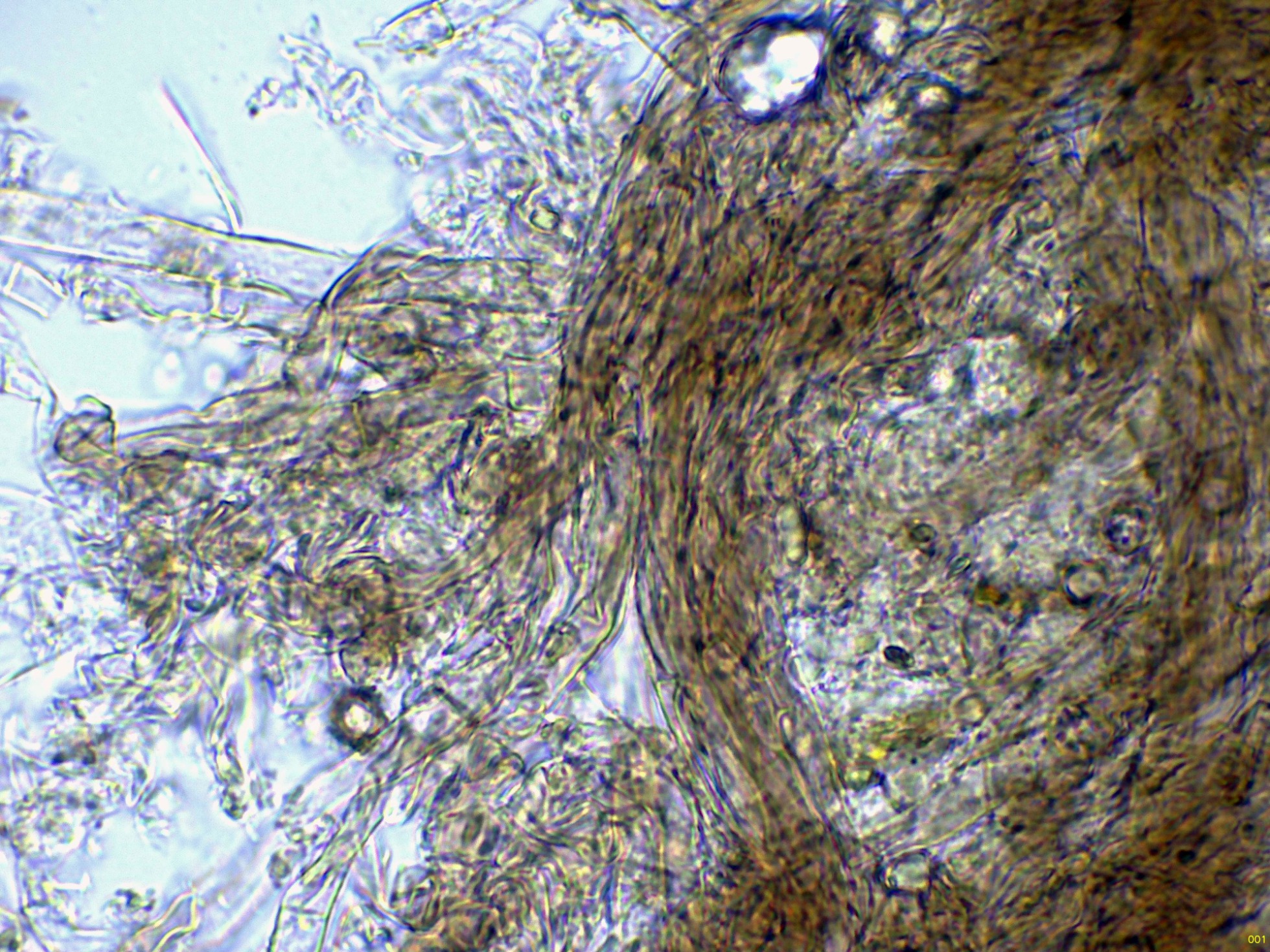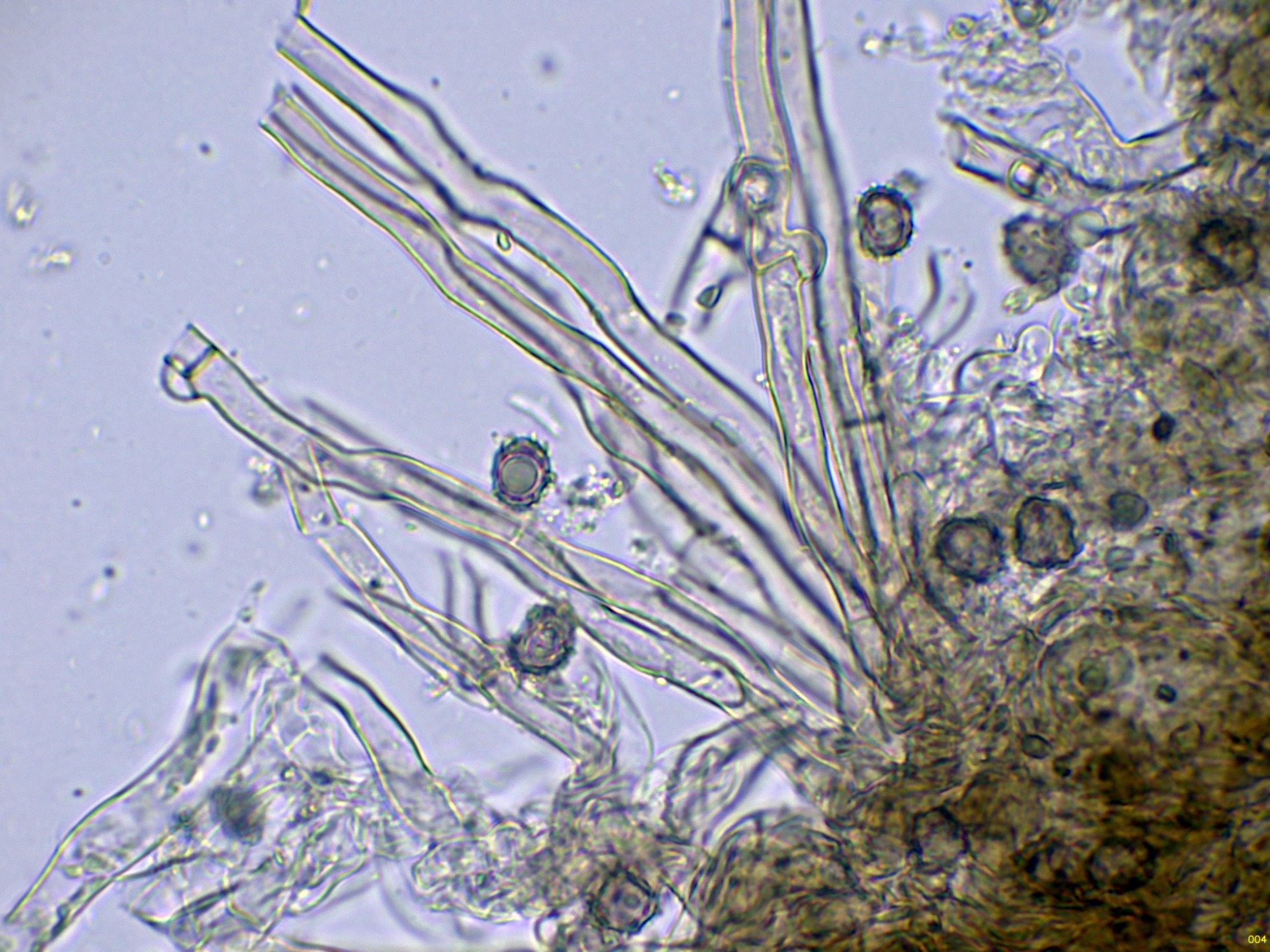 Extremos de las ramificaciones hialinos, curiosamente en estos extremos no pude observar basidios, por lo que los debo considerar estériles.