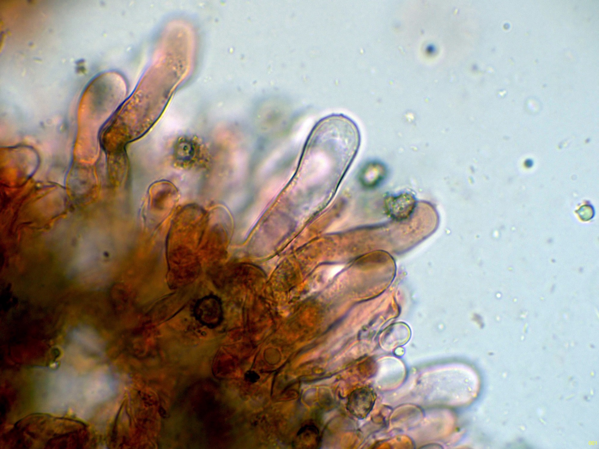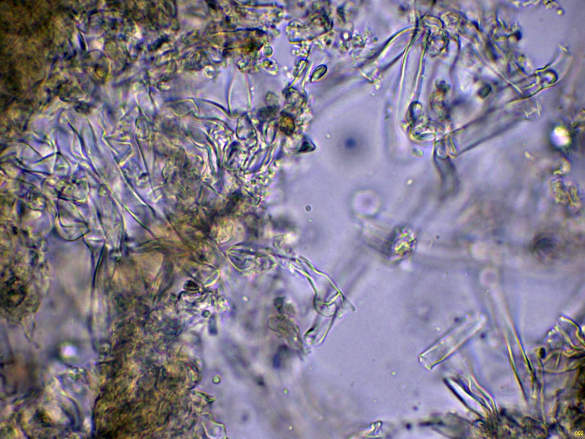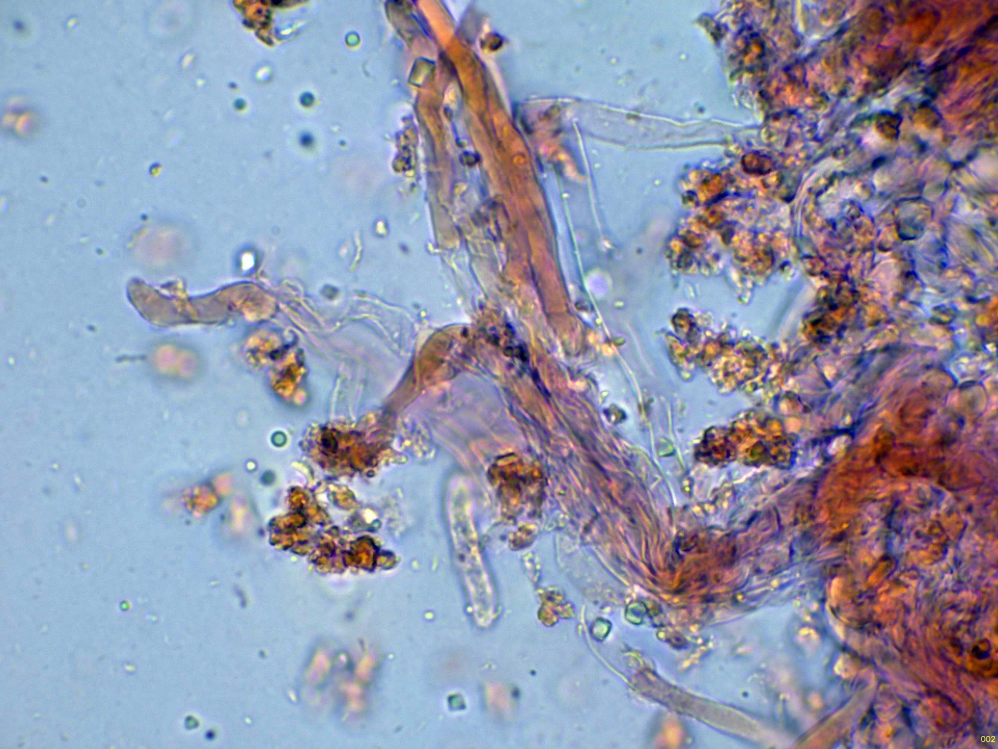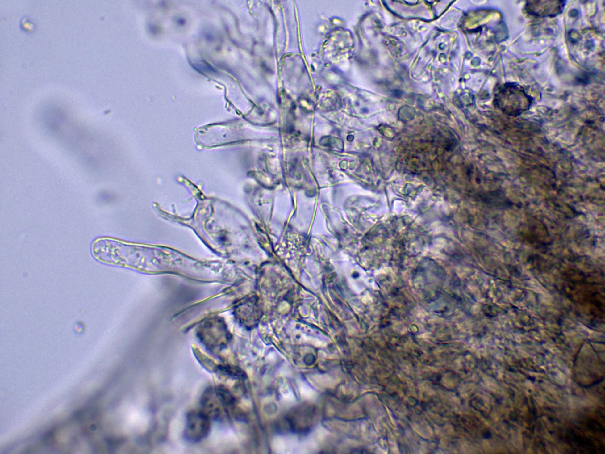 Extremos de las ramificaciones hialinos, curiosamente en estos extremos no pude observar basidios, por lo que los debo considerar estériles.