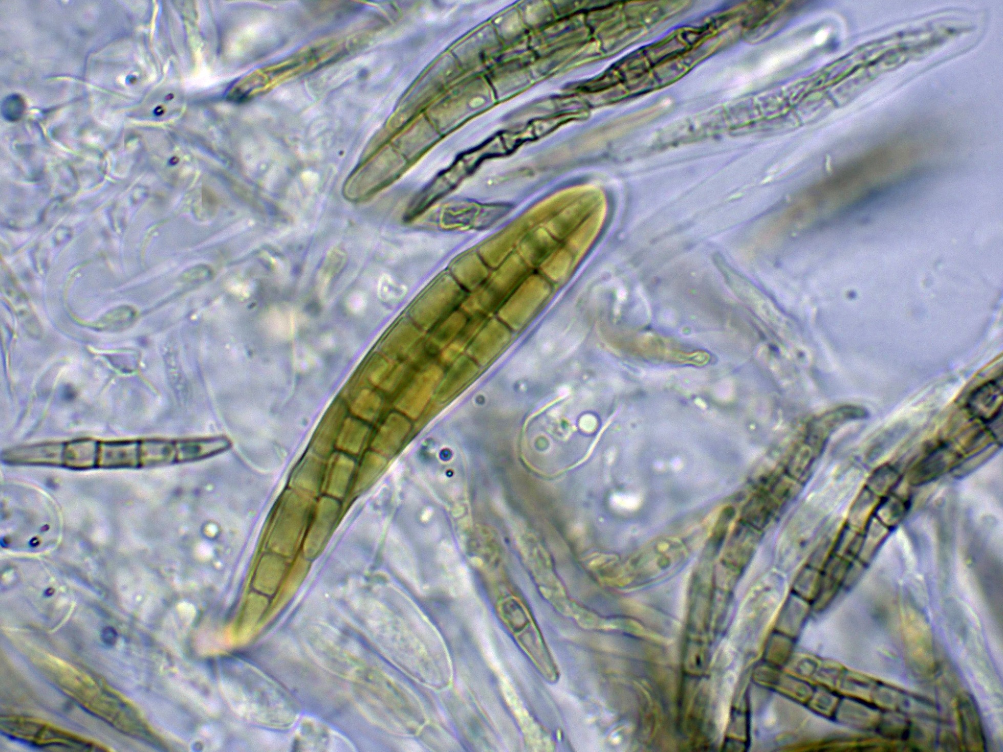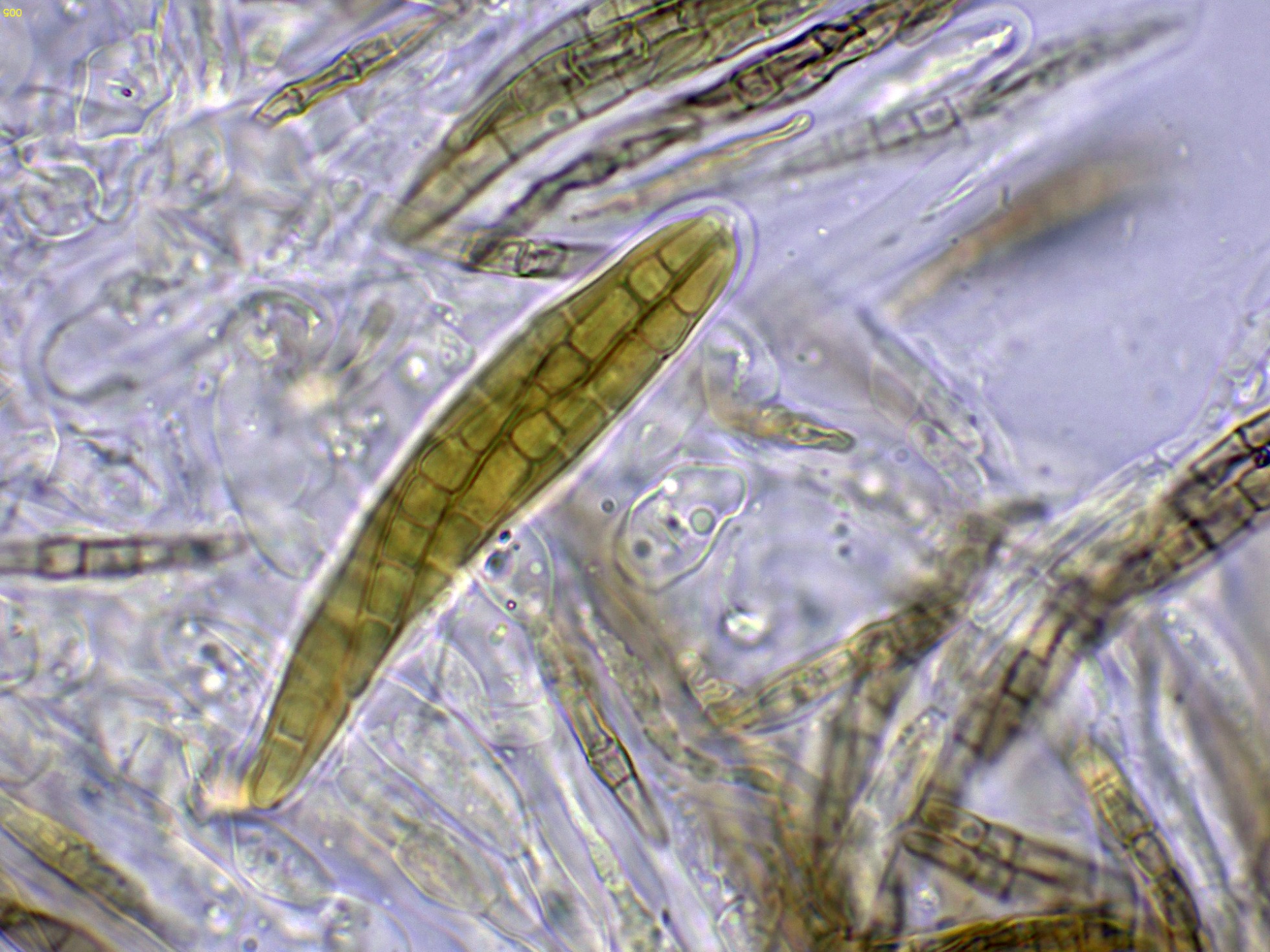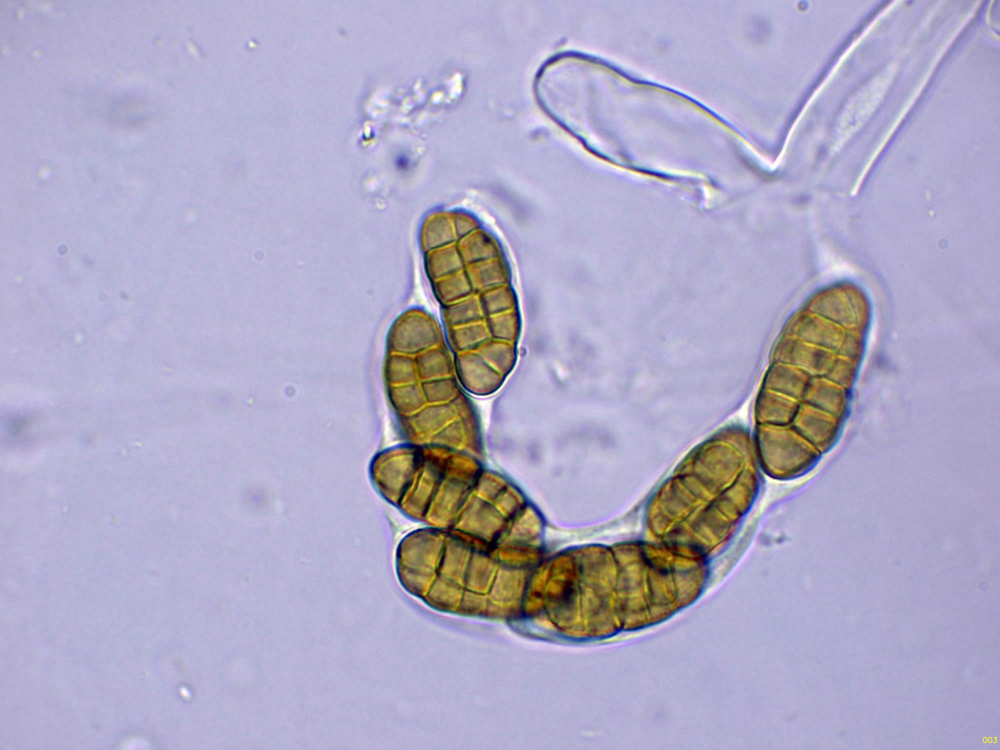 La Leptosphaeria modesta se caracteriza por un constreñimiento marcado en la espora en el segundo septo, muy parecida a su congénere la Leptosphaeria maculans, con esporas de mayor tamaño, con 5 septos y en este caso el de mayor constreñimineto debería ser el tercero, aun así hace falta disponer de más material en fresco para poder confirmar al 100% la especie, de ahí lo de "cf".