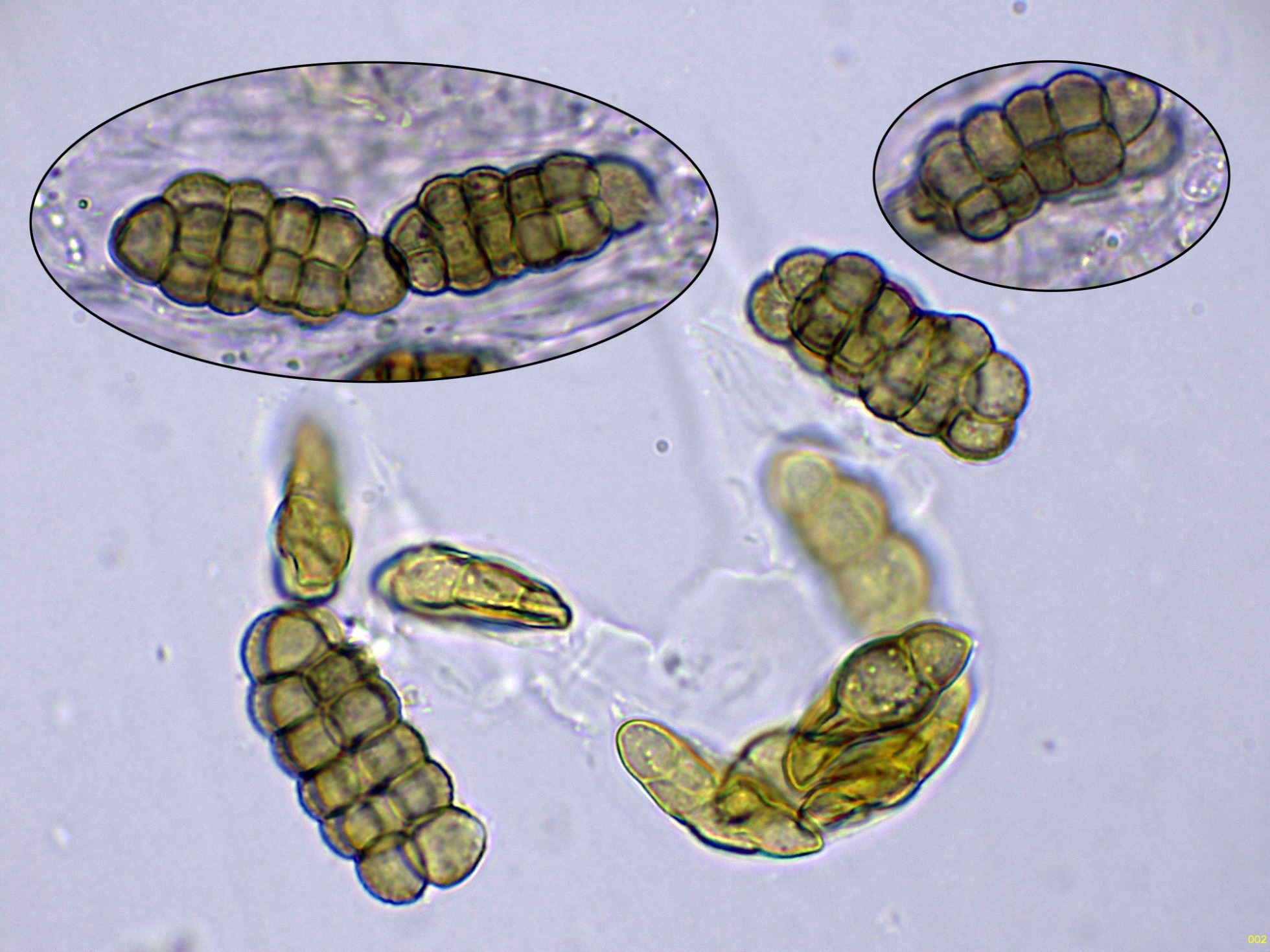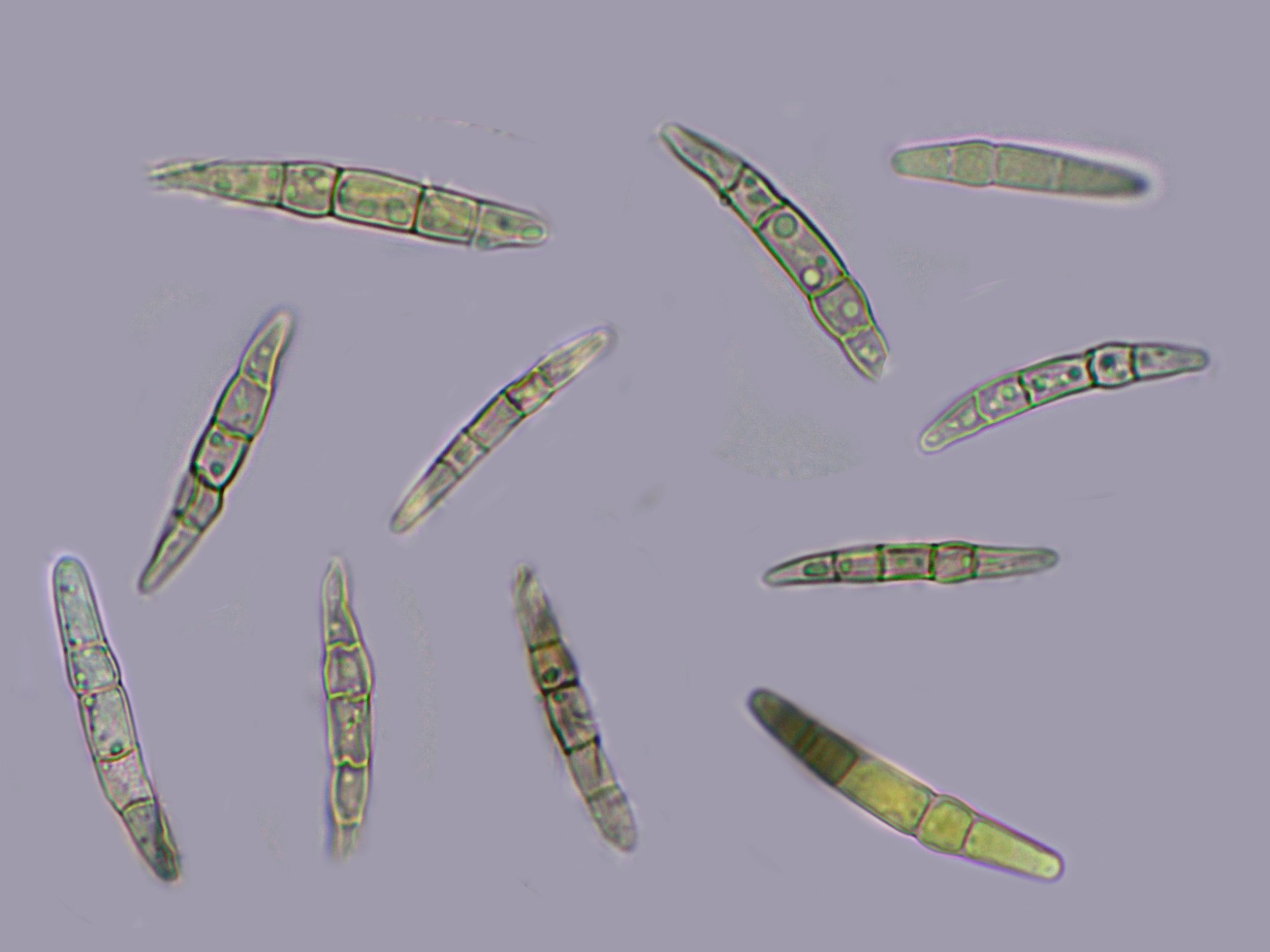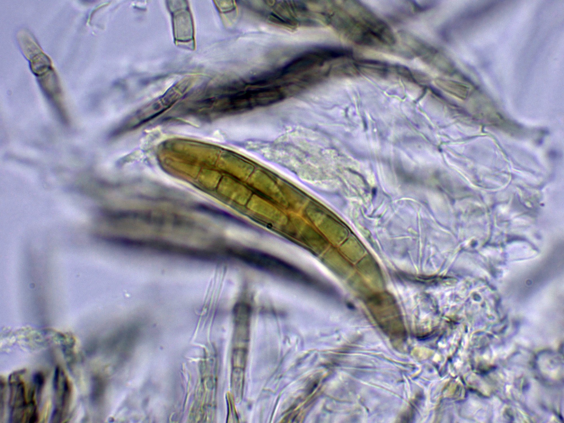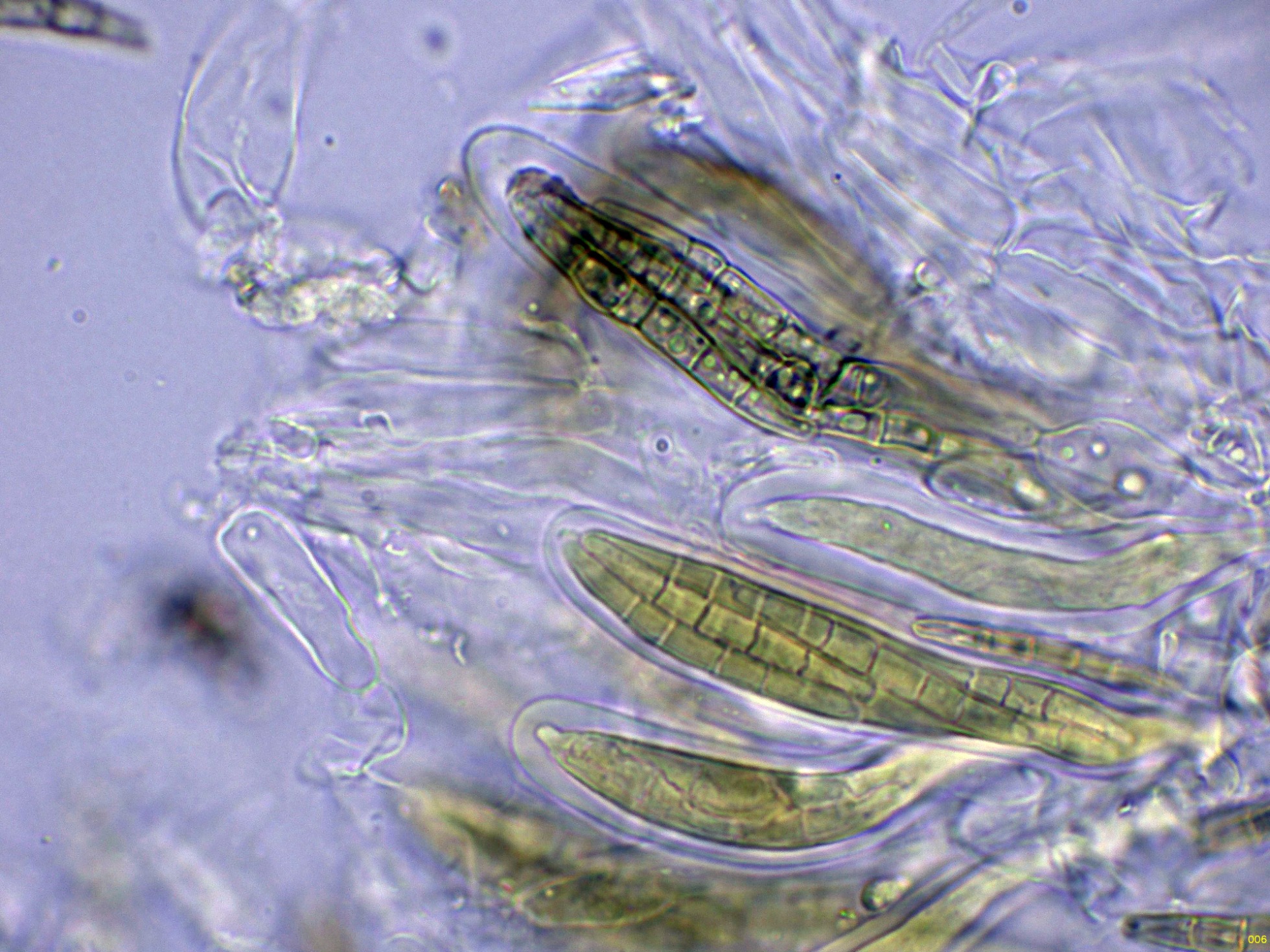 La Leptosphaeria modesta se caracteriza por un constreñimiento marcado en la espora en el segundo septo, muy parecida a su congénere la Leptosphaeria maculans, con esporas de mayor tamaño, con 5 septos y en este caso el de mayor constreñimineto debería ser el tercero, aun así hace falta disponer de más material en fresco para poder confirmar al 100% la especie, de ahí lo de "cf".