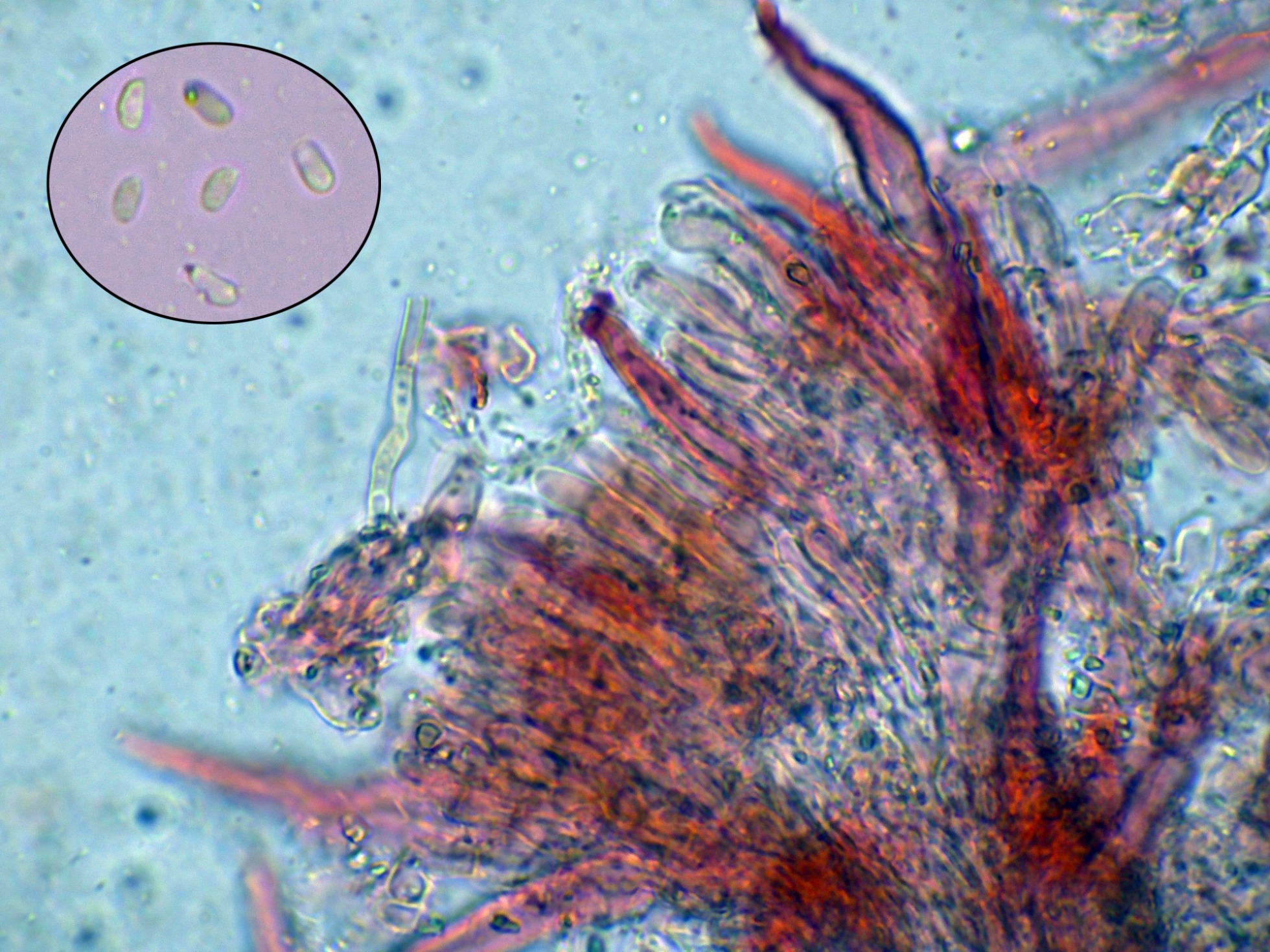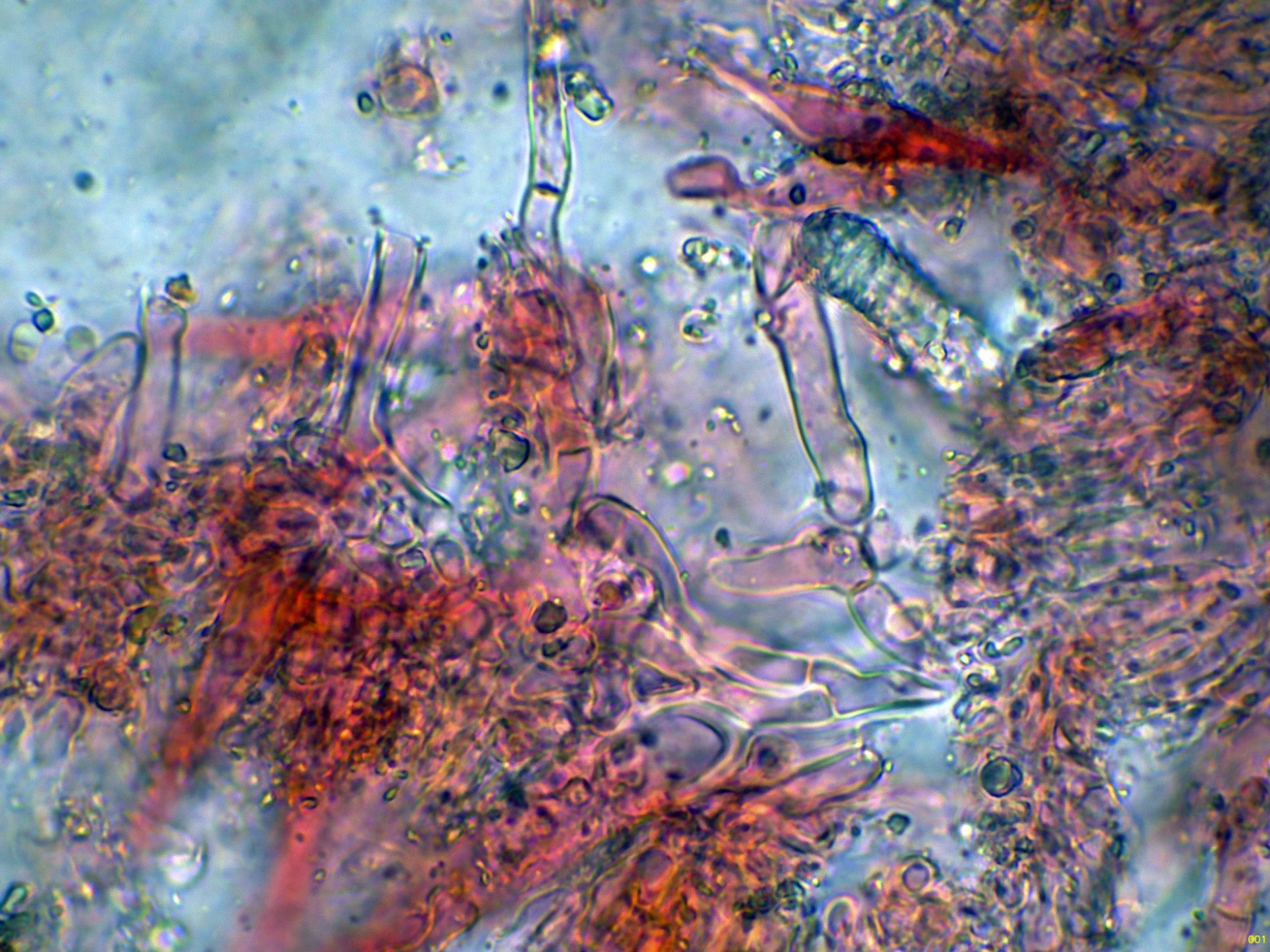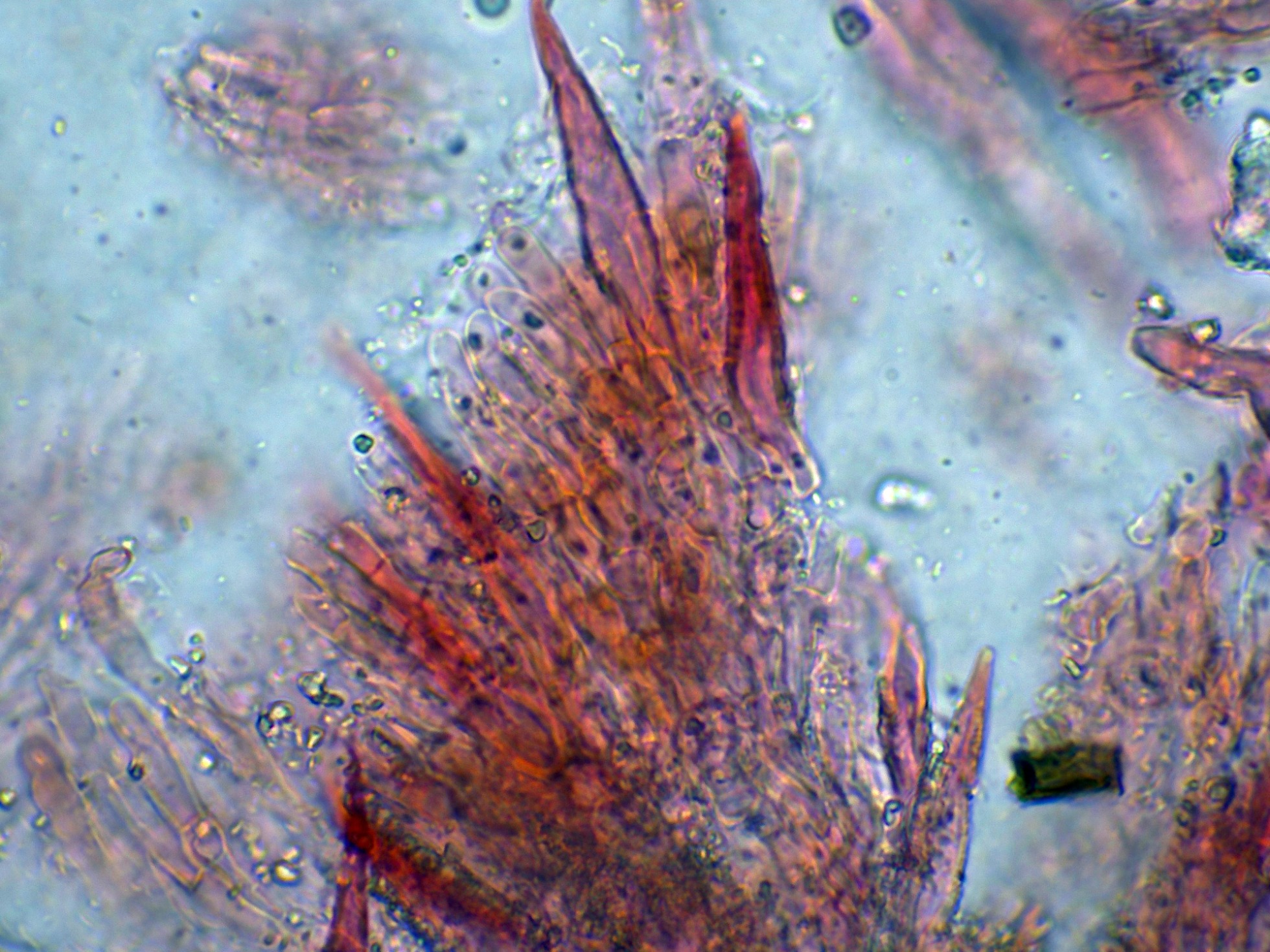 Para terminar con esta entrega, un Corticioide bastante común, con grandes lamprocistidios, la Scopuloides rimosa: