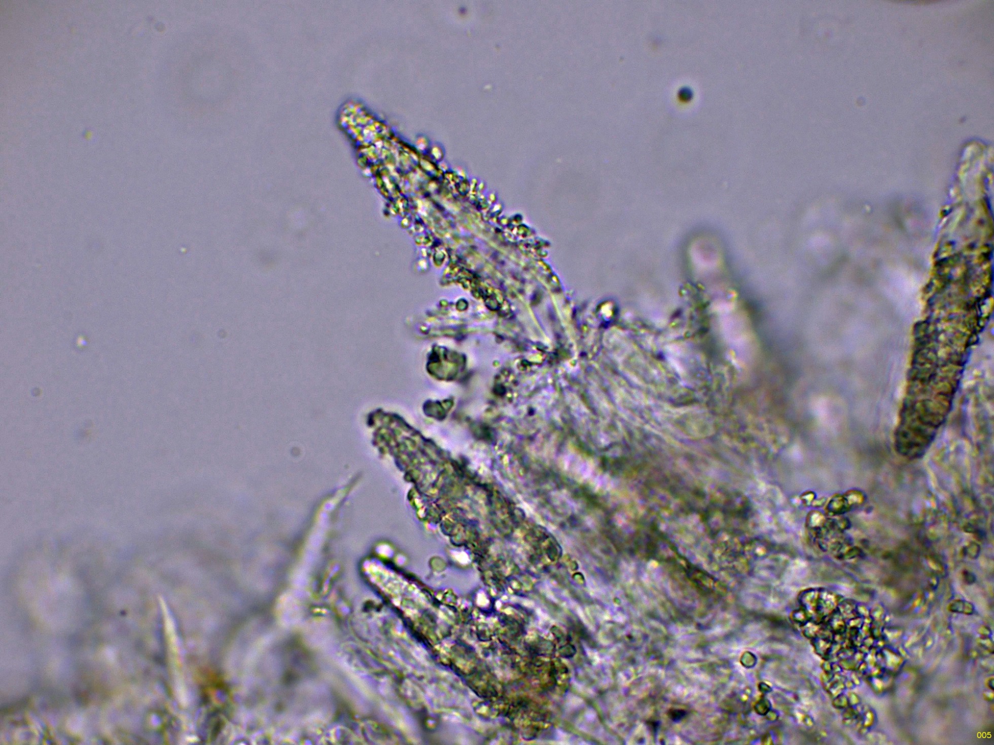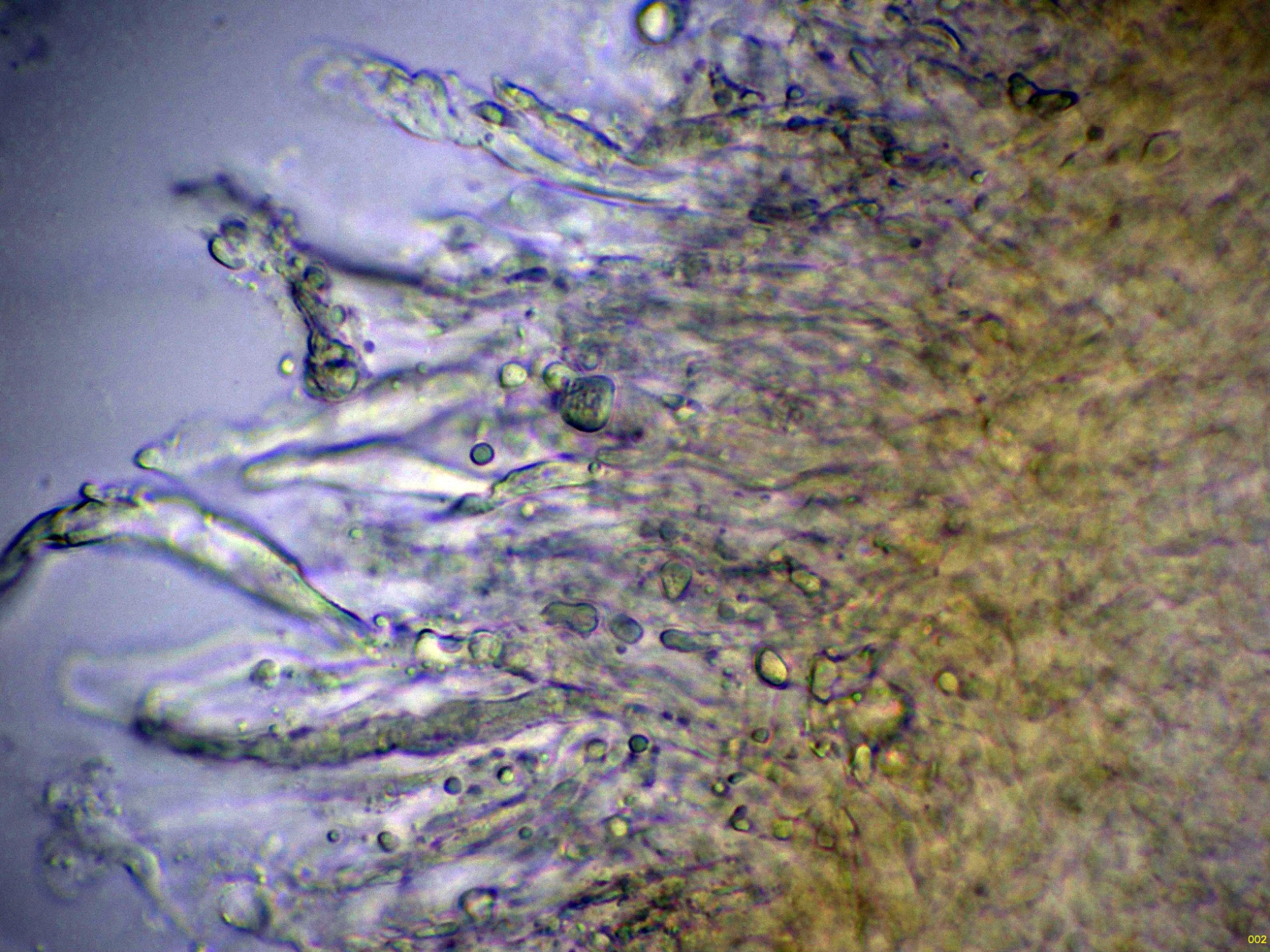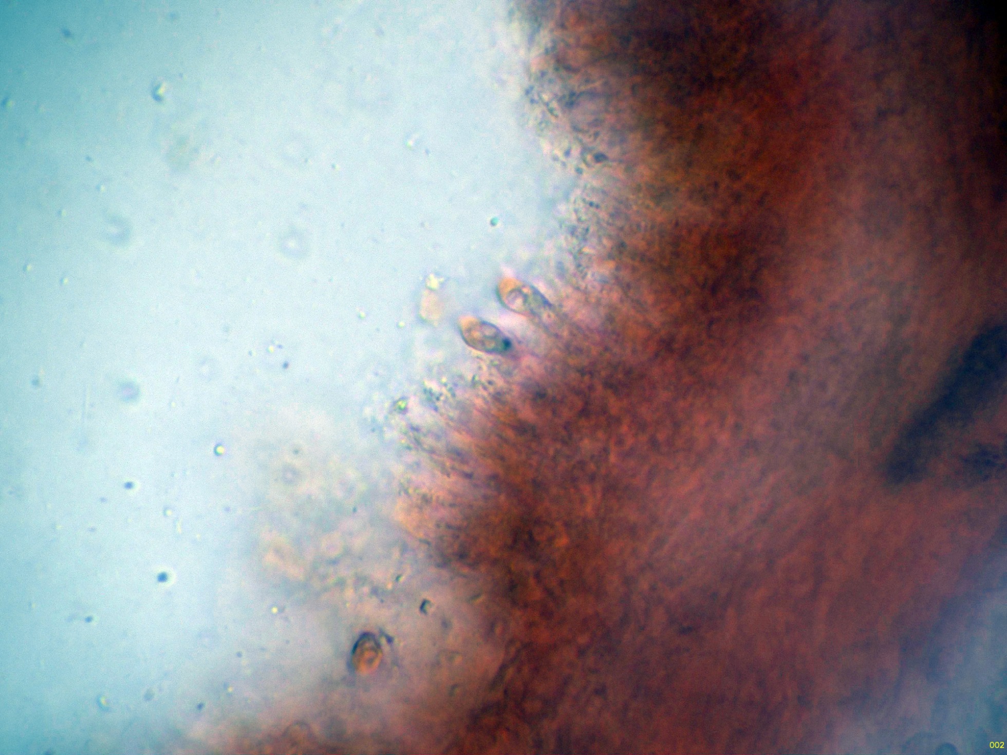 Para terminar con esta entrega, un Corticioide bastante común, con grandes lamprocistidios, la Scopuloides rimosa: