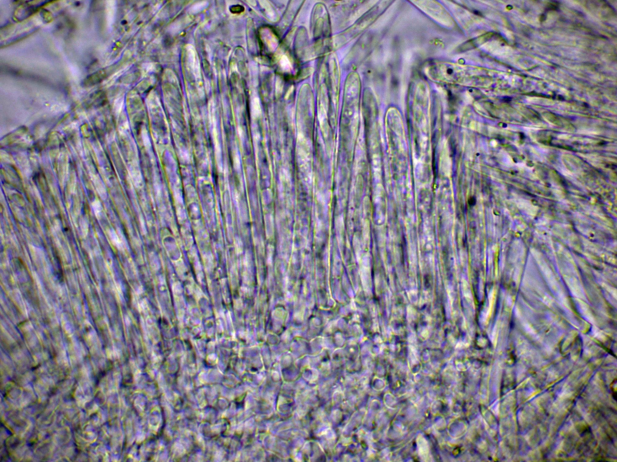 El himenio con los ascos y paráfisis en solución de Rojo Congo: