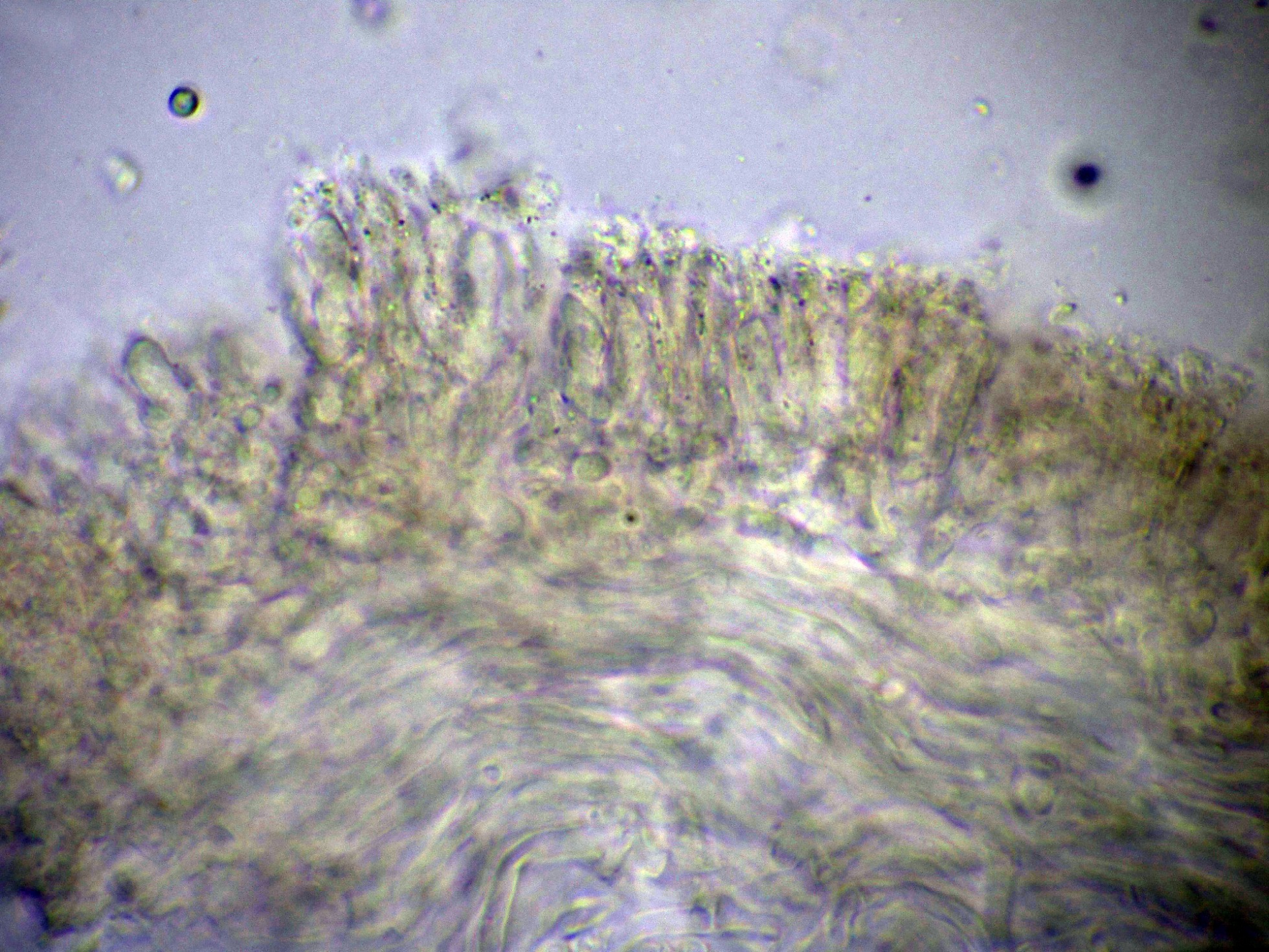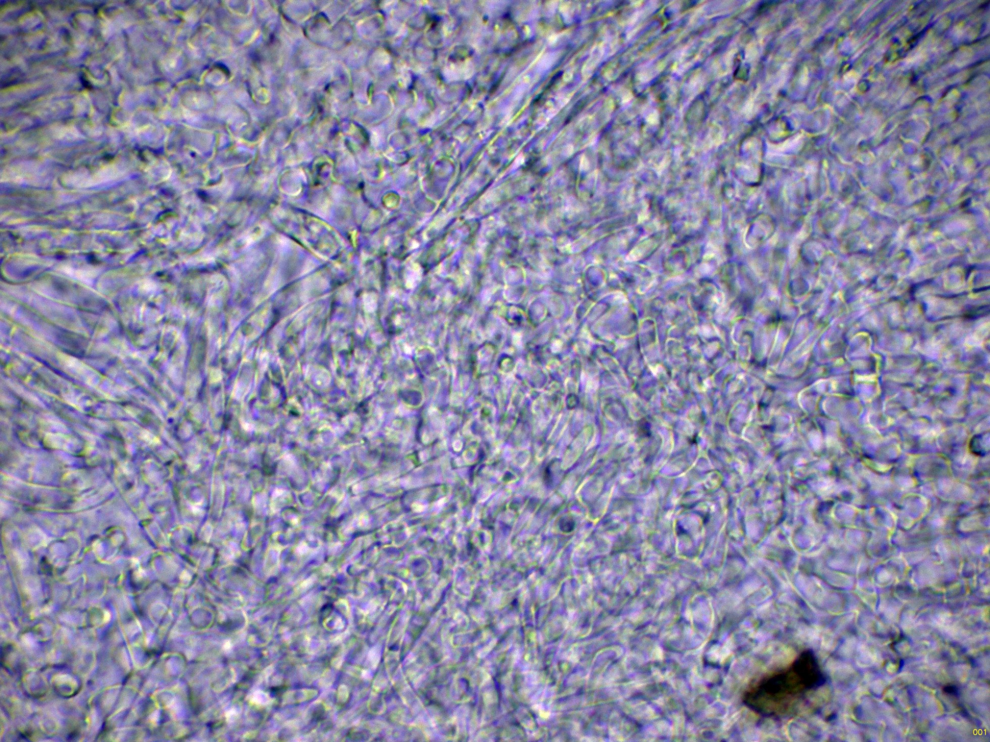 La arista laminar en solución de amoníaco a 400 aumentos, solo una gran masa de cistidios opacos que no dejan entrever ningun otro elemento:
