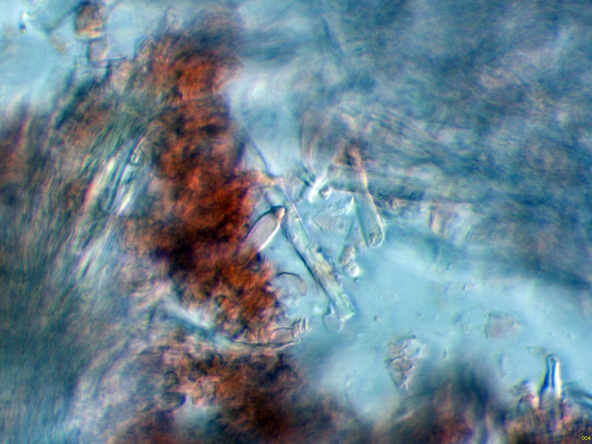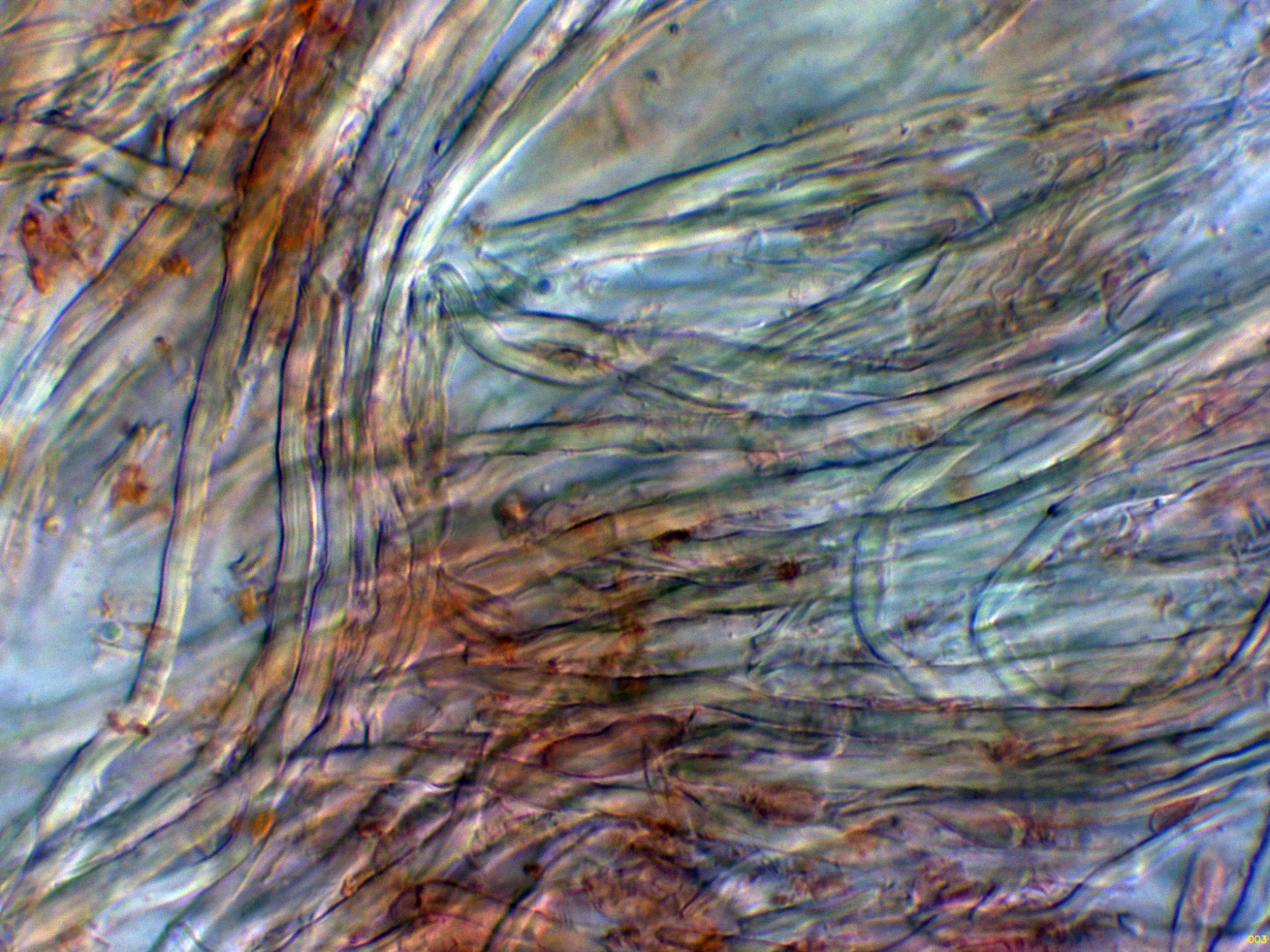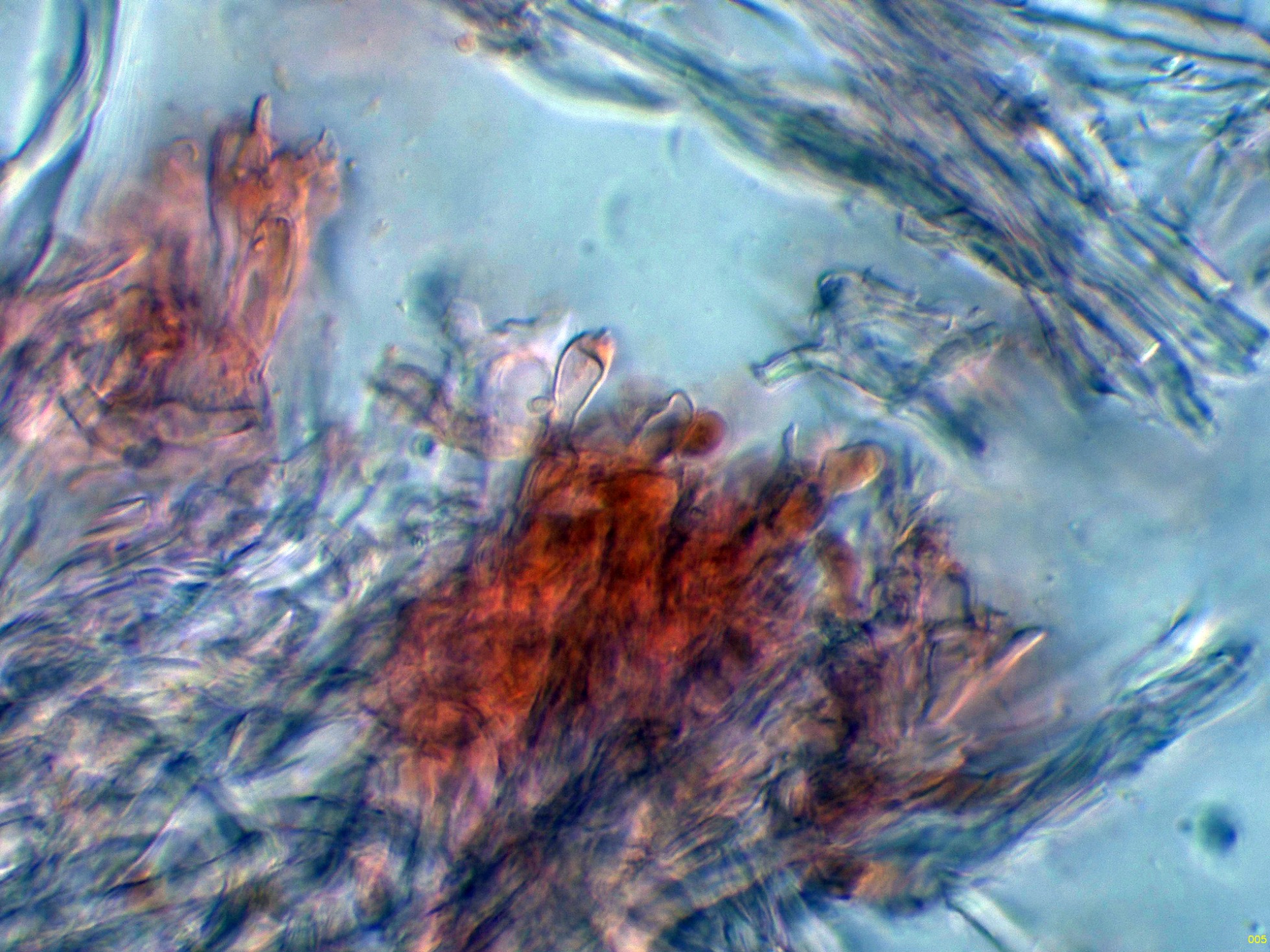 El himenio en solución de Rojo Congo, con numerosos cistidios con cristalizaciones típicos del género: