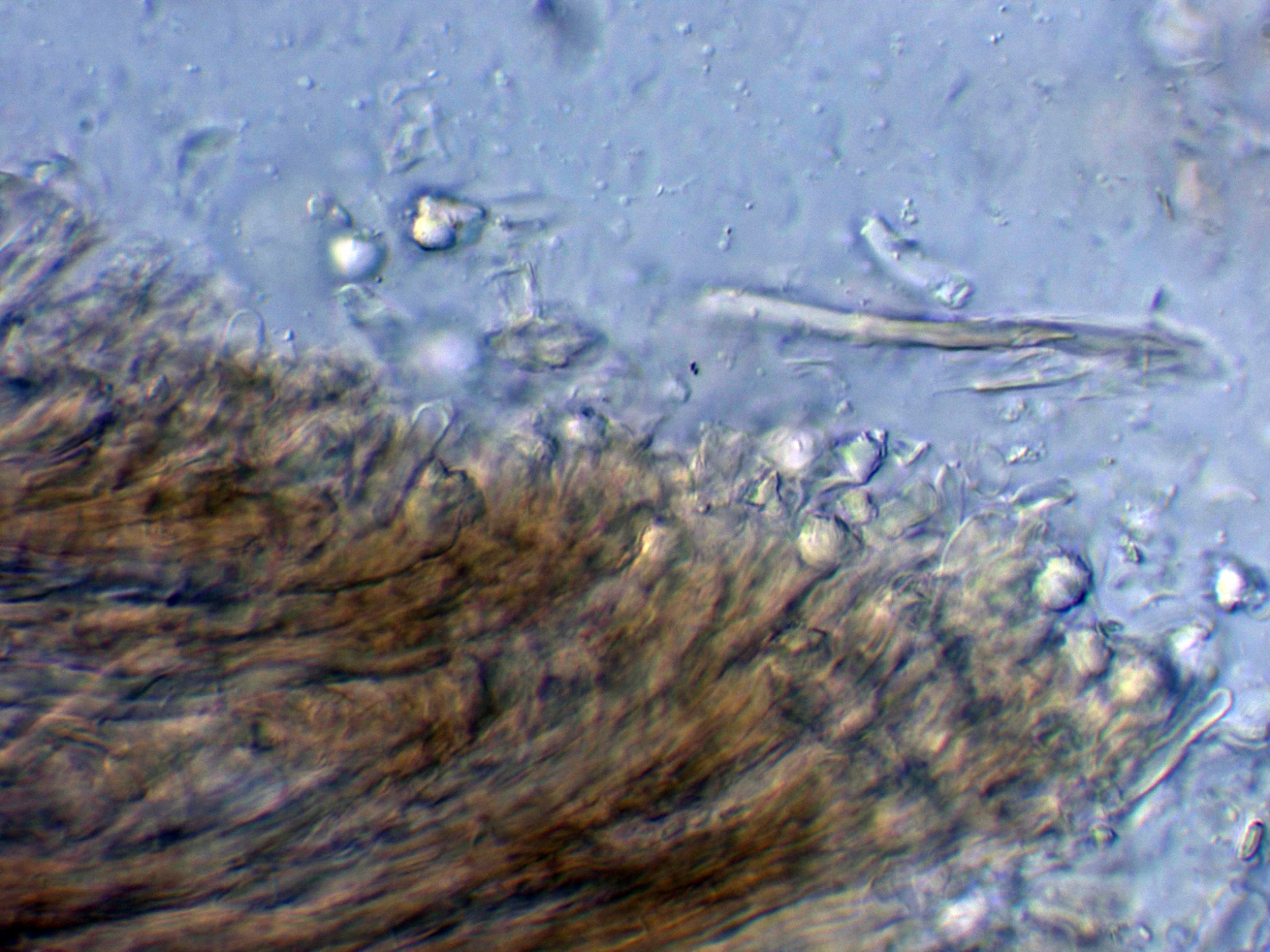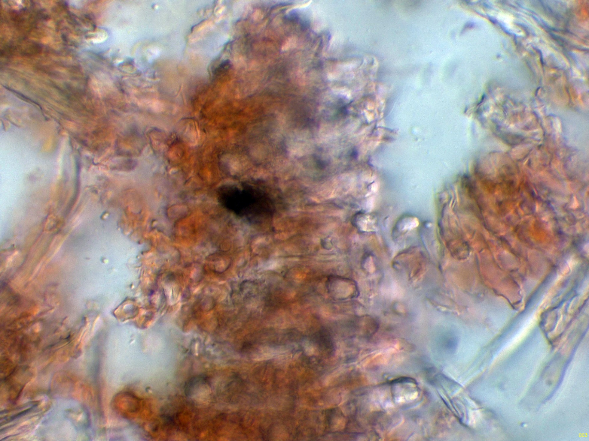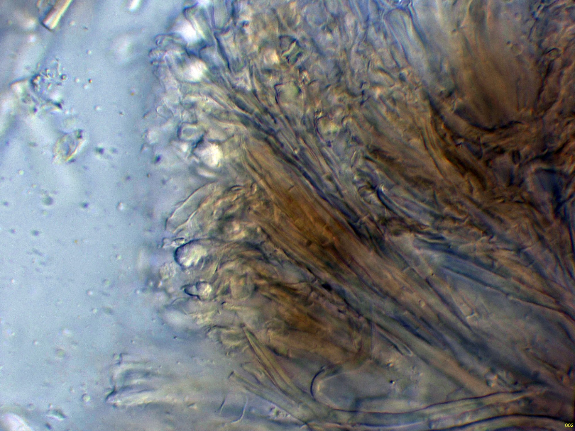 El himenio en solución de Rojo Congo, con numerosos cistidios con cristalizaciones típicos del género: