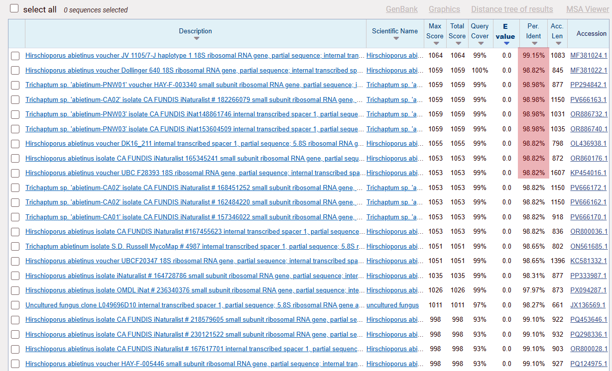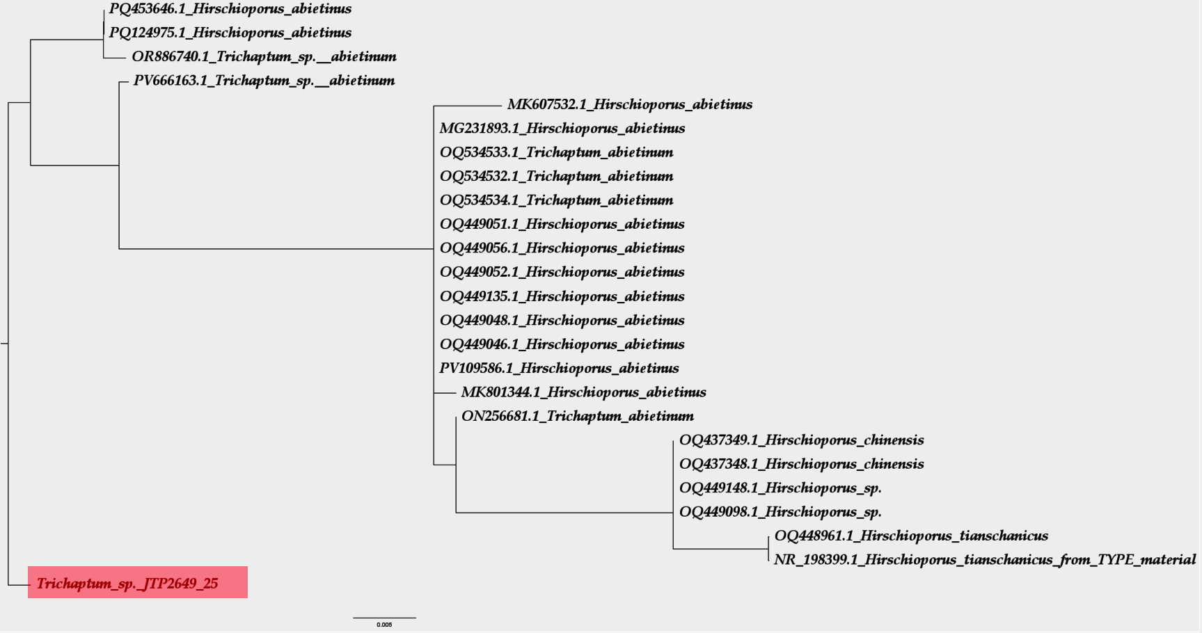 A pesar de que en el Blast se indica una coincidencia a nivel molecular del 99% con el Trichaptum abietinum, esta opción la debo descartar por no coincidir microscópicamente con mi propuesta, con lo que tenemos que estar ante una nueva especie de Trichaptum aún no descrita o por lo menos no secuenciada hasta el momento, queda pues como: